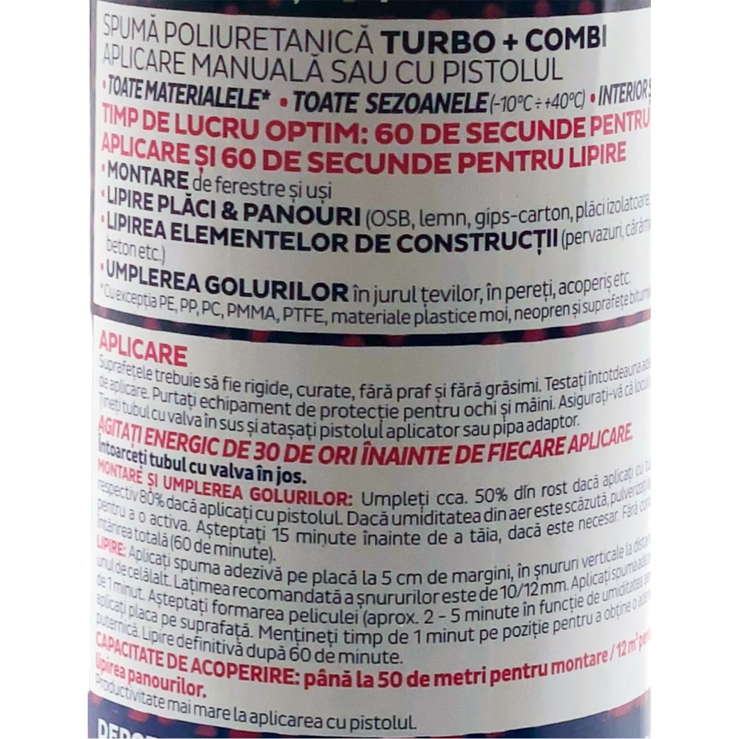 Spumă poliuretanică TURBO+COMBI. Aplicare manuală sau cu pistolul. Aplicare pe toate materialele, în orice sezon.