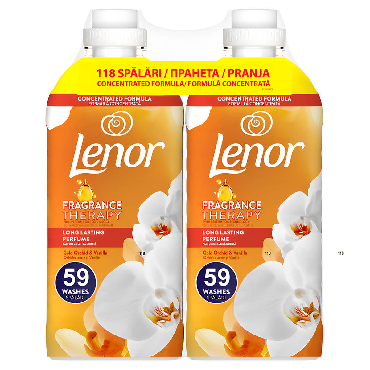 Clătitor pentru rufe Lenor Gold Orchid & Vanilla 2 x 1239 ml — un pachet dublu de balsam concentrat pentru rufe, suficient pentru până la 118 spălări, cu un parfum rafinat de orhidee aurie și vanilie.