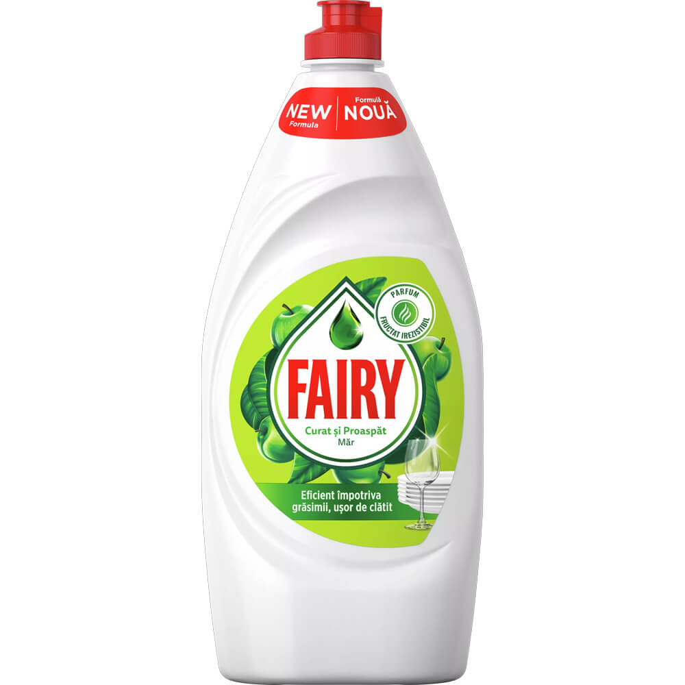 Soluția pentru spălat vase Fairy Măr verde curăță eficient orice tip de vas, inclusiv cele mai dificile murdării. Componentele active ale detergentului dizolvă ușor grăsimea chiar și în apă rece, prevenind depunerea acesteia pe vase și pe mâini. Formula special dezvoltată pentru spălarea manuală a vaselor protejează pielea mâinilor și previne uscarea după spălare. Datorită spumei dense și persistente și eficienței în apă rece, soluția Fairy are un consum economic.