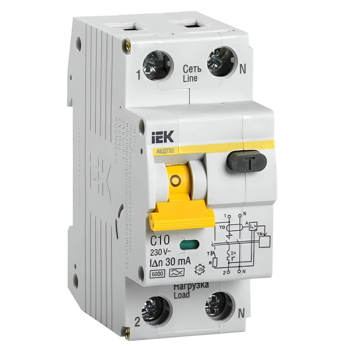 Întrerupător automat diferențial IEK AVDT32 2P, C, 10 A, 30 mA, tip A — un dispozitiv fiabil care combină funcțiile unui întrerupător automat și ale unui dispozitiv de protecție diferențială. Este destinat protecției persoanelor împotriva electrocutării, prevenirii incendiilor cauzate de curenți de scurgere și protecției instalațiilor electrice împotriva suprasarcinilor și scurtcircuitelor.