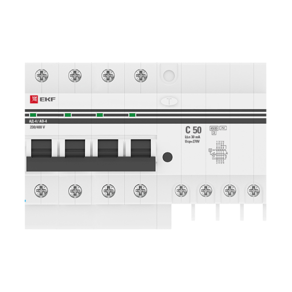 Întrerupător automat diferențial EKF PROxima AD-4 50A/ 30 mA (C, AC, electronic) 4,5 kA - Acest dispozitiv combină funcțiile unui întrerupător de circuit și ale unui dispozitiv de protecție. Atunci când este detectat un curent de pământ sau o suprasarcină, acesta deconectează rețeaua. Întrerupătoarele diferențiale EKF au protecție la supratensiune.