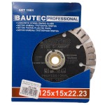 Discul diamantat segmentat Bautec Professional 1501, cu un diametru de 125 mm și o grosime a marginii tăietoare de 2,2 mm, este destinat pentru utilizare universală la tăierea betonului, betonului armat, pietrei, gresiei, pavajului, cărămizii și granitului.