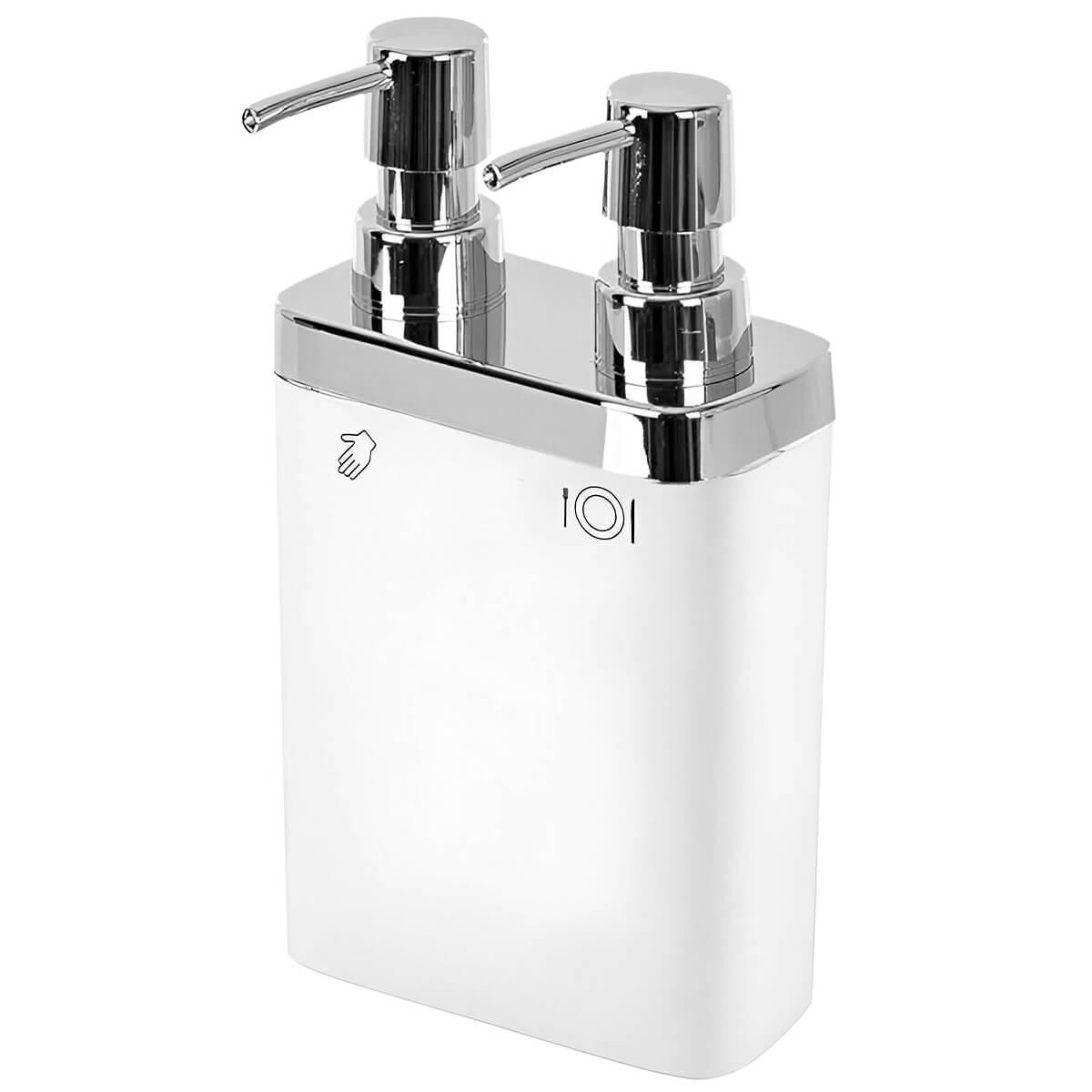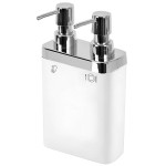 Dozatorul dublu pentru săpun lichid Primanova 121122 este fabricat din plastic rezistent și are dimensiuni compacte: înălțime 220 mm, lățime 125 mm, adâncime 60 mm. Corpul elegant alb, cu pompe cromate, este ideal pentru baie sau bucătărie.