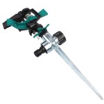 Țărușul metalic se fixează ușor în sol și menține stabil aspersorul chiar și la presiuni ridicate ale apei.