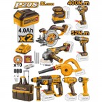 Set de instrumente cu acumulator INGCO CKLI2098 20 V, 2 x 4 Ah, 9 bucăți