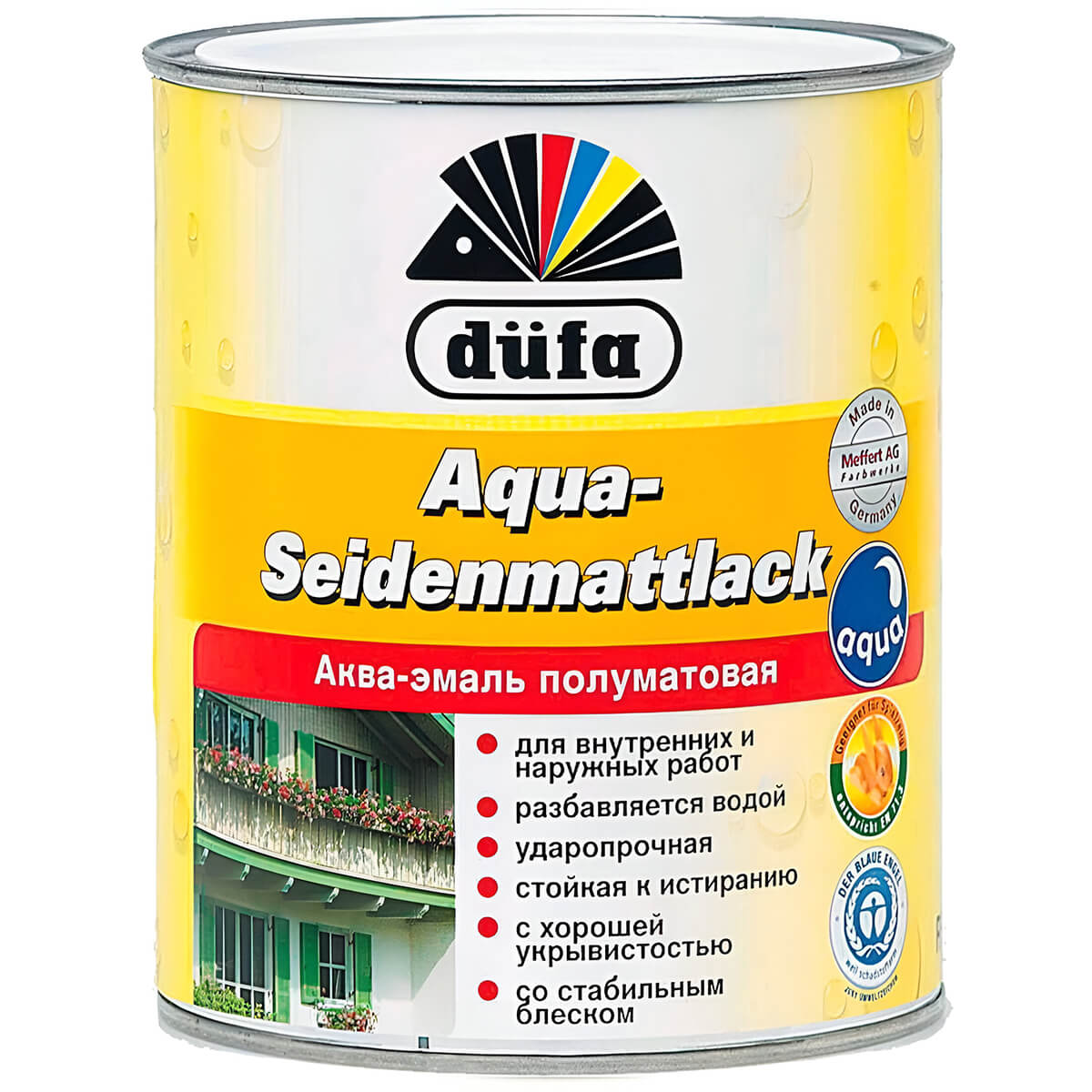 Email acrilic Aqua-Seidenmattlack pentru exterior și interior. Are o putere mare de acoperire, diluat cu apă. Formează un strat rezistent la abraziune și la intemperii. Se utilizează pentru vopsirea lemnului, metalului amorsat, tencuielii, betonului, plăcilor din fibră, substraturilor minerale, acoperirilor alchidice, PVC-ului dur.