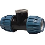 Teu pentru țevi din polietilenă de compresie adaptor Elysee 20 x 20 x 1/2 filet intern (F) - Folosit ca o ramificare a fluxului de apă în două direcții. Acest teu are două ieșiri pentru țevi de 20 mm și una cu filet interior de 1/2".