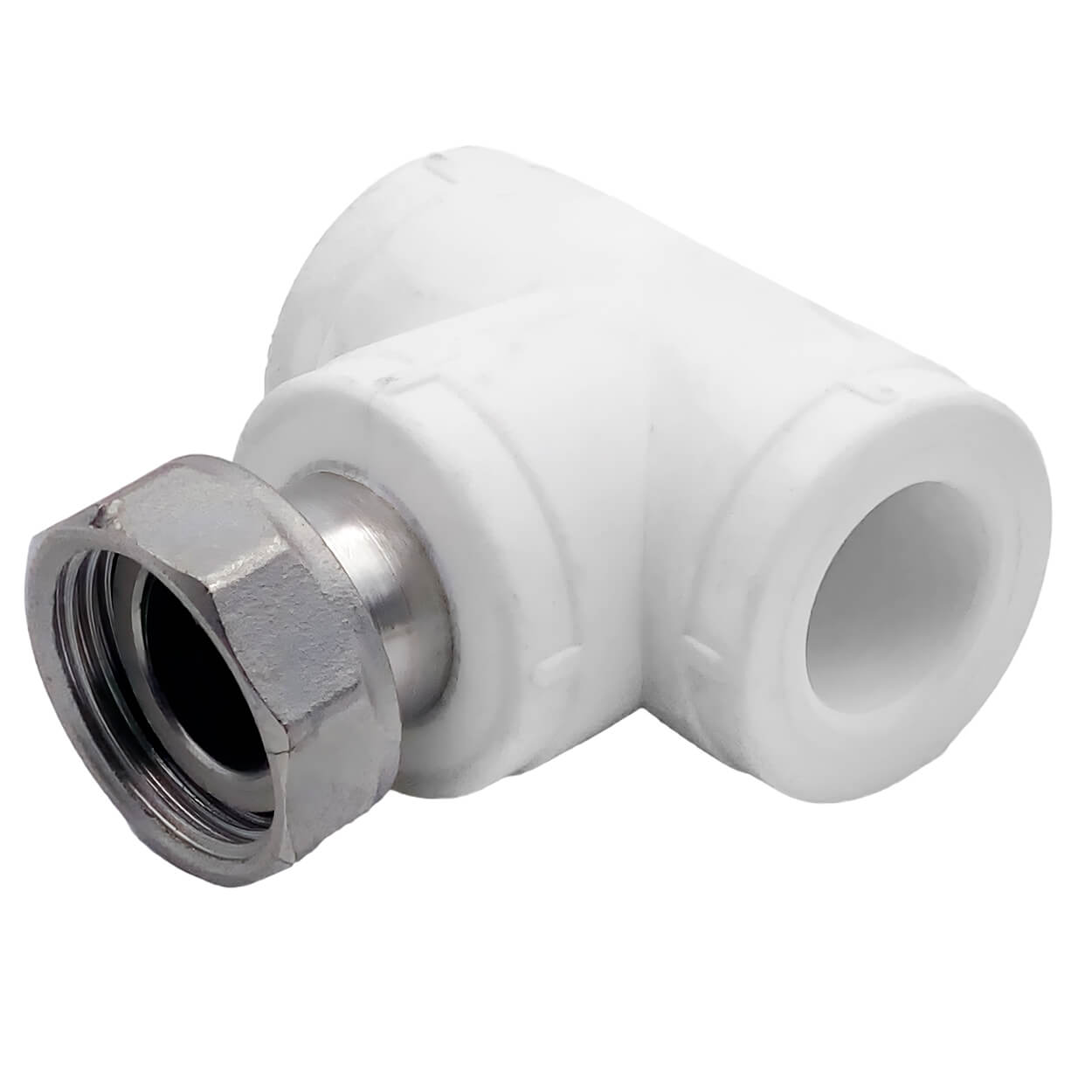 Teu din polipropilenă cu piuliță, alb, 20 mm x 3/4 inch filet intern (Mama)