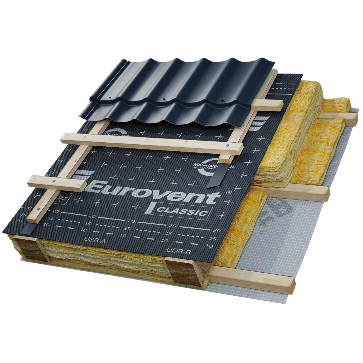 Membrana pentru acoperiș Eurovent CLASSIC, cu o densitate de 120 g/m² și o suprafață de 75 m² (1,5 m x 50 pm), de culoare neagră. Este o membrană superdifuză, tristrat, ideală pentru acoperișurile înclinate, izolate și ventilate. Potrivită pentru diferite tipuri de învelitori, cum ar fi țigla de beton, țigla metalică, și ca protecție împotriva vântului în construcțiile cu schelet. Disponibilă cu două benzi adezive autocolante - sistemul SK2.