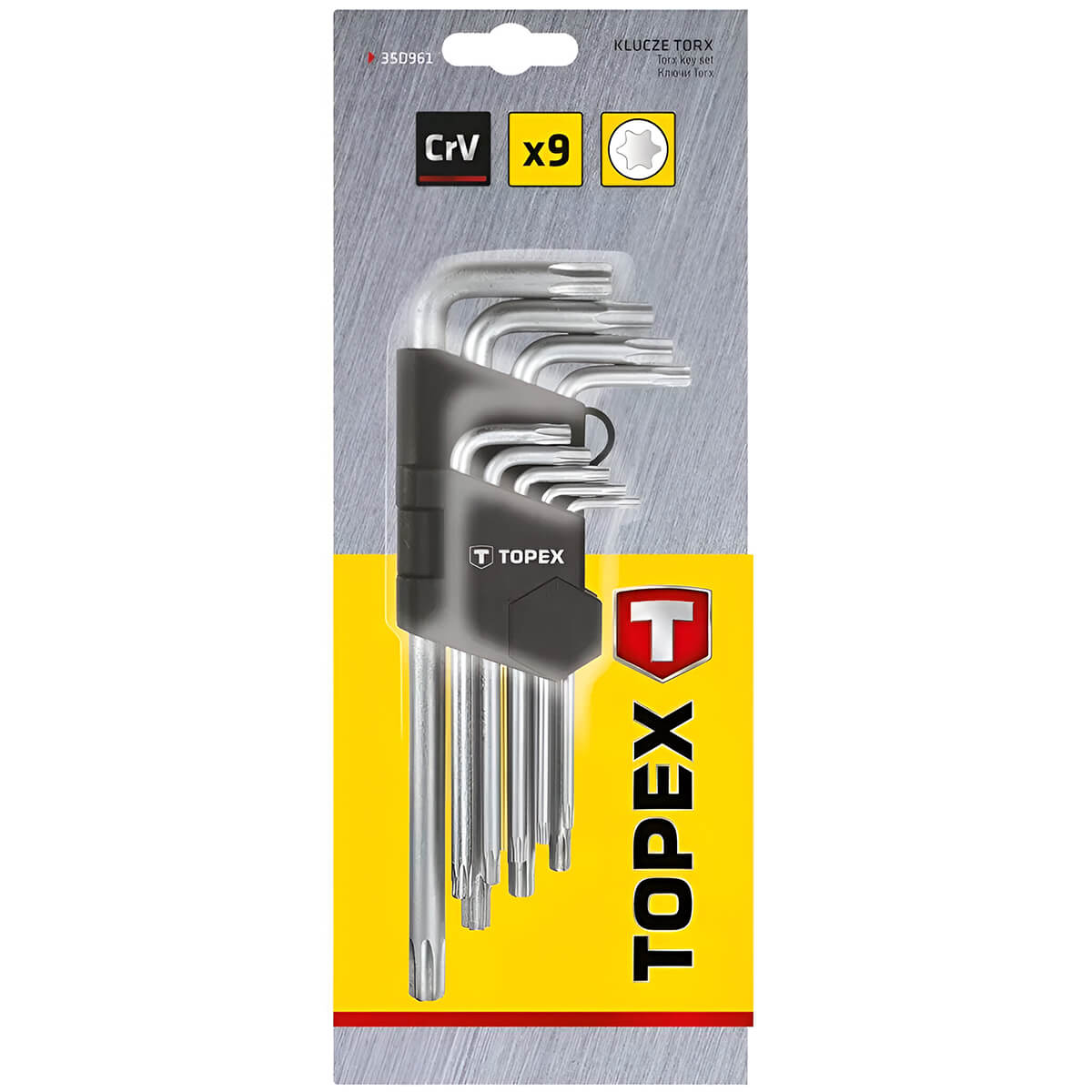 Set de chei TORX 9 buc. TOPEX T10-T50 35D961 - este conceput pentru a lucra cu elemente de fixare Torx. Fabricat din oțel crom vanadiu, puternic și durabil. Forma în L asigură un cuplu ridicat.
