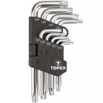 Set de chei pentagonale scurte (chei stea) TOPEX TS10-50, 9 bucăți 35D950 — un set practic și universal, care va fi un ajutor de încredere în diverse lucrări de reparații și montaj. Cheile sunt fabricate din oțel crom-vanadiu durabil, ceea ce le garantează durabilitatea și rezistența la uzură. Ambalajul din plastic, cu compartimente pentru fiecare cheie, facilitează depozitarea și transportul, făcând utilizarea setului încă mai confortabilă.