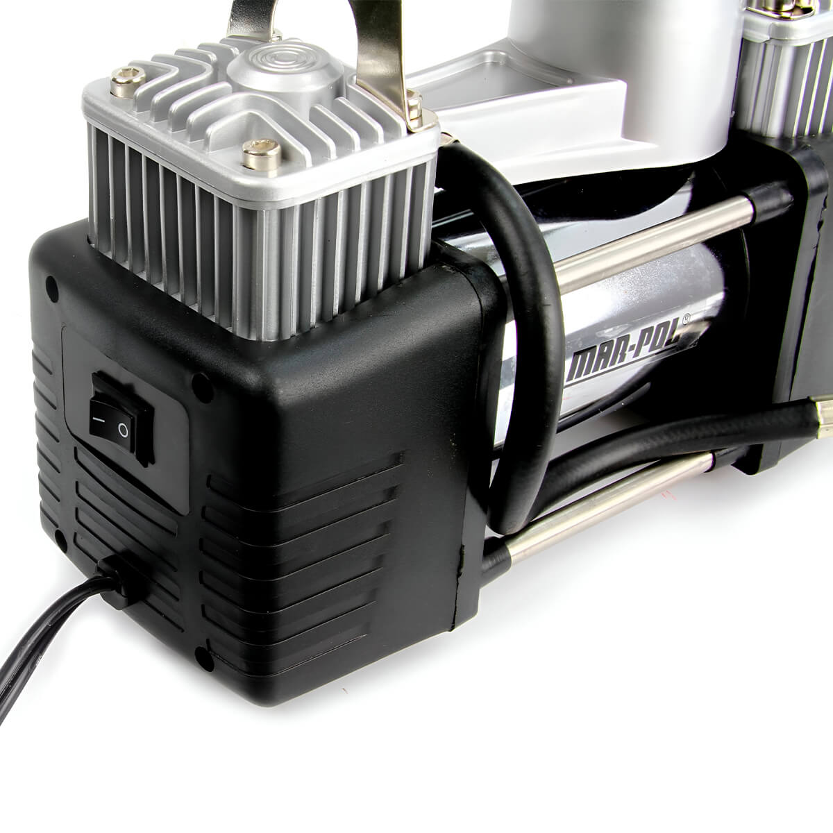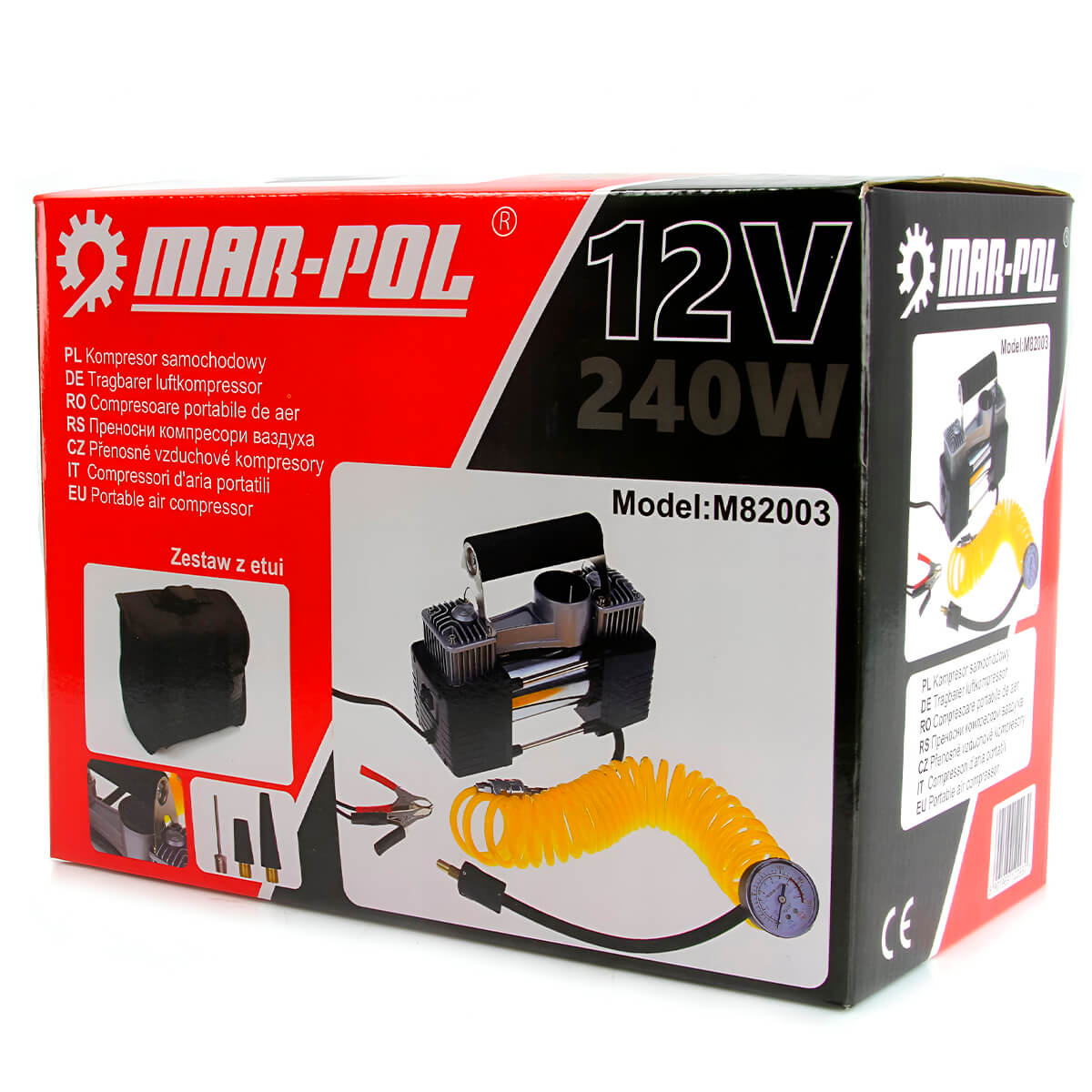 Compresorul auto MAR‑POL M82003 de 12 V este un model puternic, cu două pistoane și carcasă metalică, conceput pentru umflarea rapidă și eficientă a anvelopelor, precum și pentru alte aplicații ce necesită un flux constant de aer la presiune înaltă. Este alegerea ideală pentru șoferii care apreciază fiabilitatea, performanța ridicată și dimensiunile compacte.