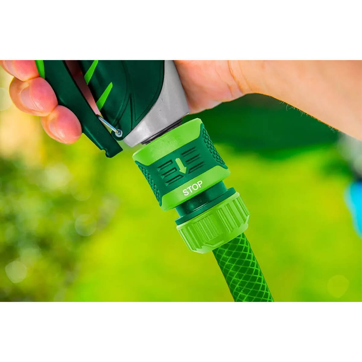 Mufă cu oprire automată VERTO 15G731 pentru furtunuri 1/2"-5/8" este destinată conectării furtunurilor cu duze de udare. Datorită sistemului AquaStop, accesoriile pot fi schimbate fără a opri apa de la robinet. Carcasa din plastic rezistent cu inserții din cauciuc asigură o prindere fermă și confortabilă, chiar și atunci când mâinile sunt ude.