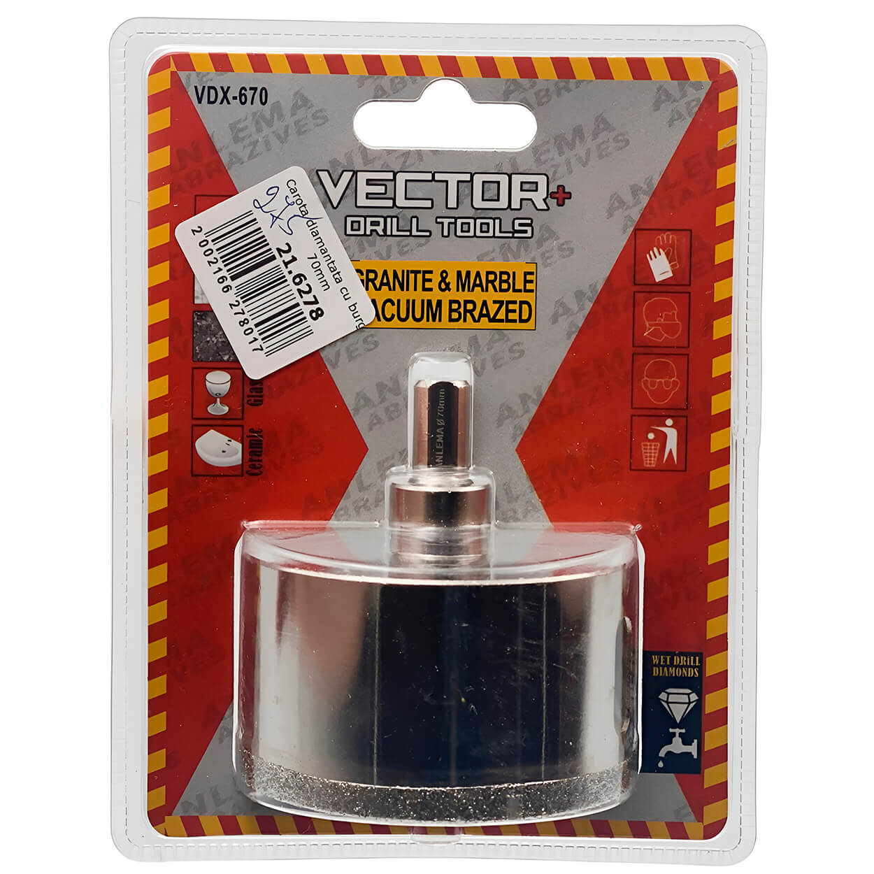 Carotă diamantată cu burghiu de centrare 70 mm VECTOR+ VDX-670 - este un instrument de înaltă calitate pentru găurirea găurilor în gresie, plăci de faianță și sticlă.
