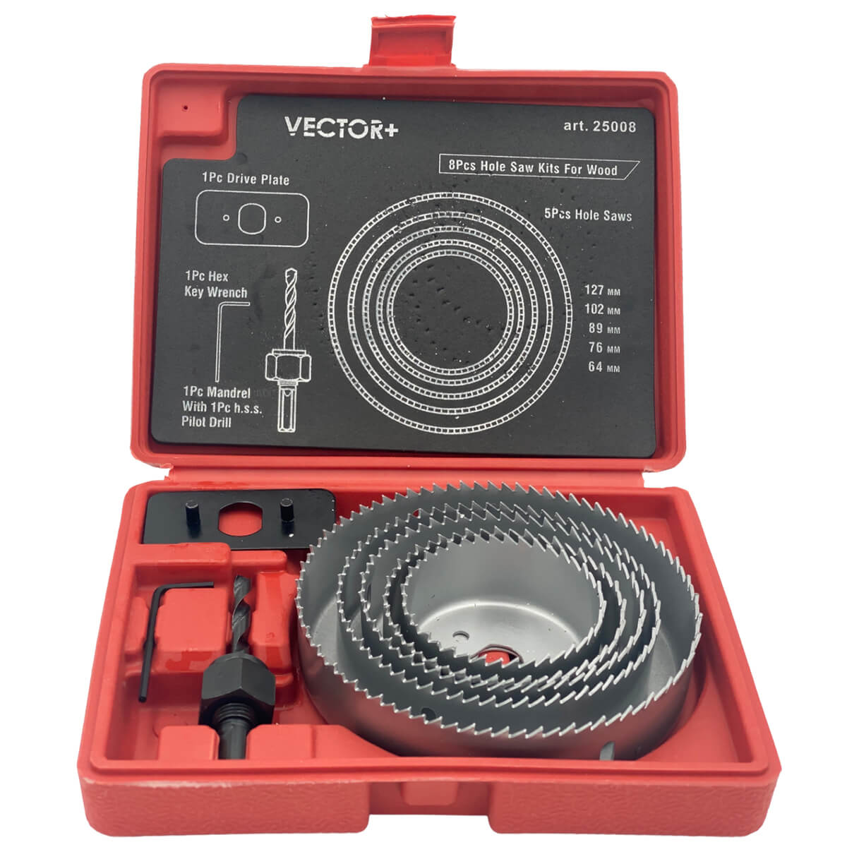 Set de carote pentru lemn VECTOR+ d64-127 mm, cu adaptoare, 8 bucăți (Art. 25008) - Pentru informații suplimentare, vă rugăm să vă adresați la consultantul magazinului VERITAN.