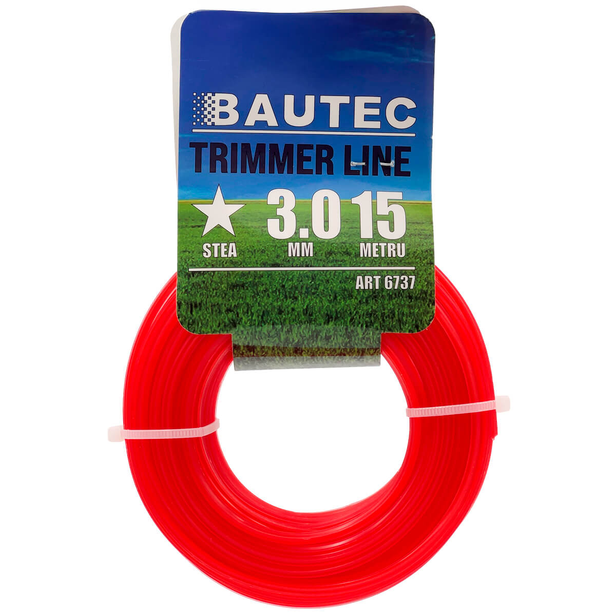 Fir pentru trimer BAUTEC 3 mm x 15 m stea (Art. 6737) este destinat tăierii ierbii cu ajutorul trimerelelor pe benzină sau electrice. Secțiunea în formă de stea îmbunătățește proprietățile de tăiere. Materialul durabil este rezistent la uzură și supraîncălzire.