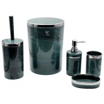 Setul include 5 accesorii pentru baie, realizate într-o nuanță profundă de verde, cu inserții metalice elegante.