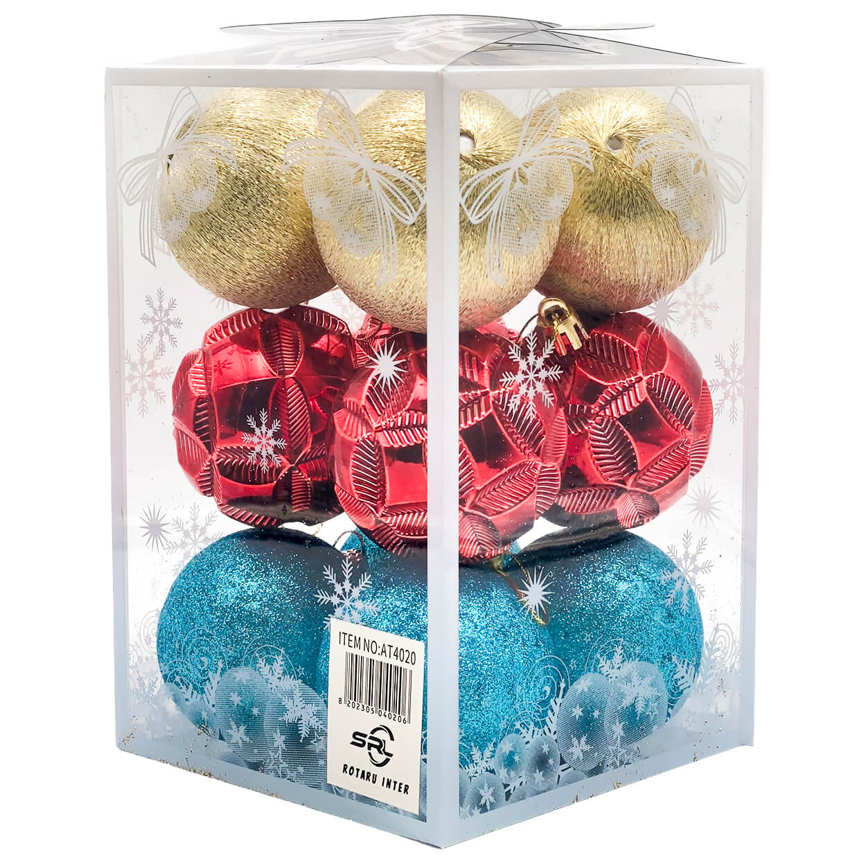 Setul de jucării pentru bradul de Crăciun, format din 12 bucăți în culorile auriu, roșu și albastru, AT4020, este o adiție minunată pentru bradul de sărbători. Setul include o varietate de 12 jucării în nuanțe strălucitoare de auriu, roșu și albastru. Este confecționat din materiale de înaltă calitate. Creează o atmosferă veselă și festivă în timpul sărbătorilor. Se fixează ușor pe ramuri și adaugă bradului un aspect colorat și atrăgător.