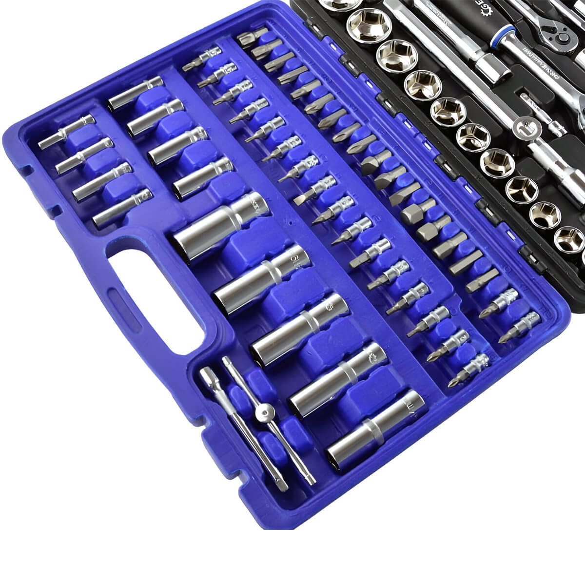 - Diversitate de instrumente: Setul include chei tubulare 1/2" și 1/4", chei tubulare lungi, prize, chei bit și multe altele, făcându-l ideal pentru realizarea diferitelor sarcini.