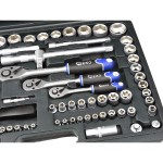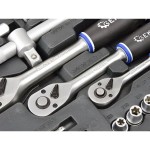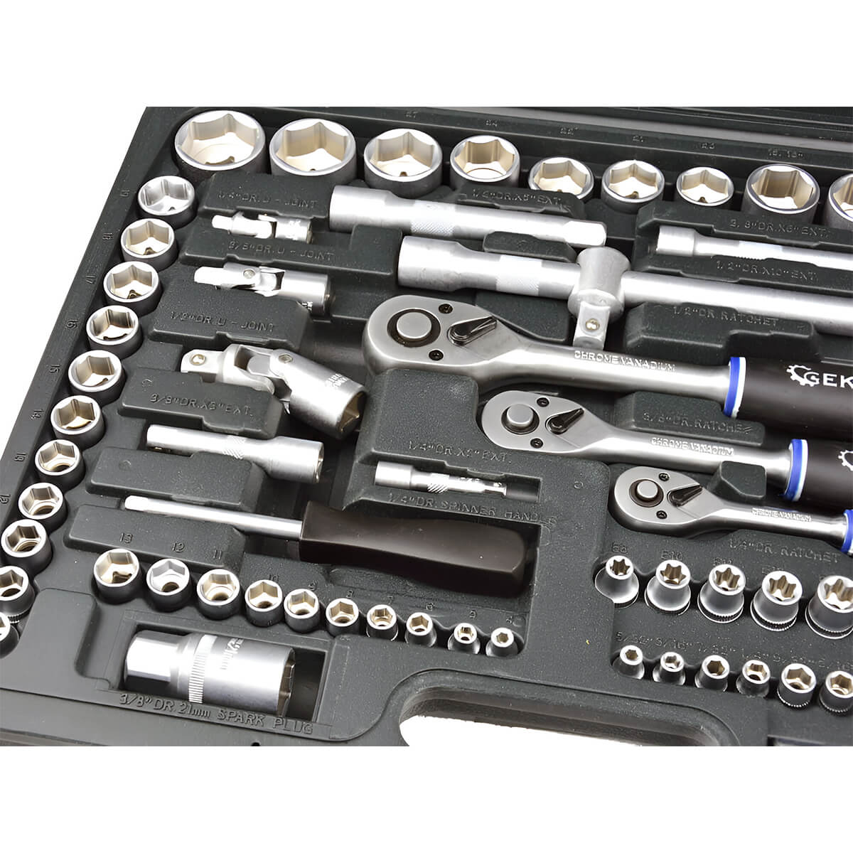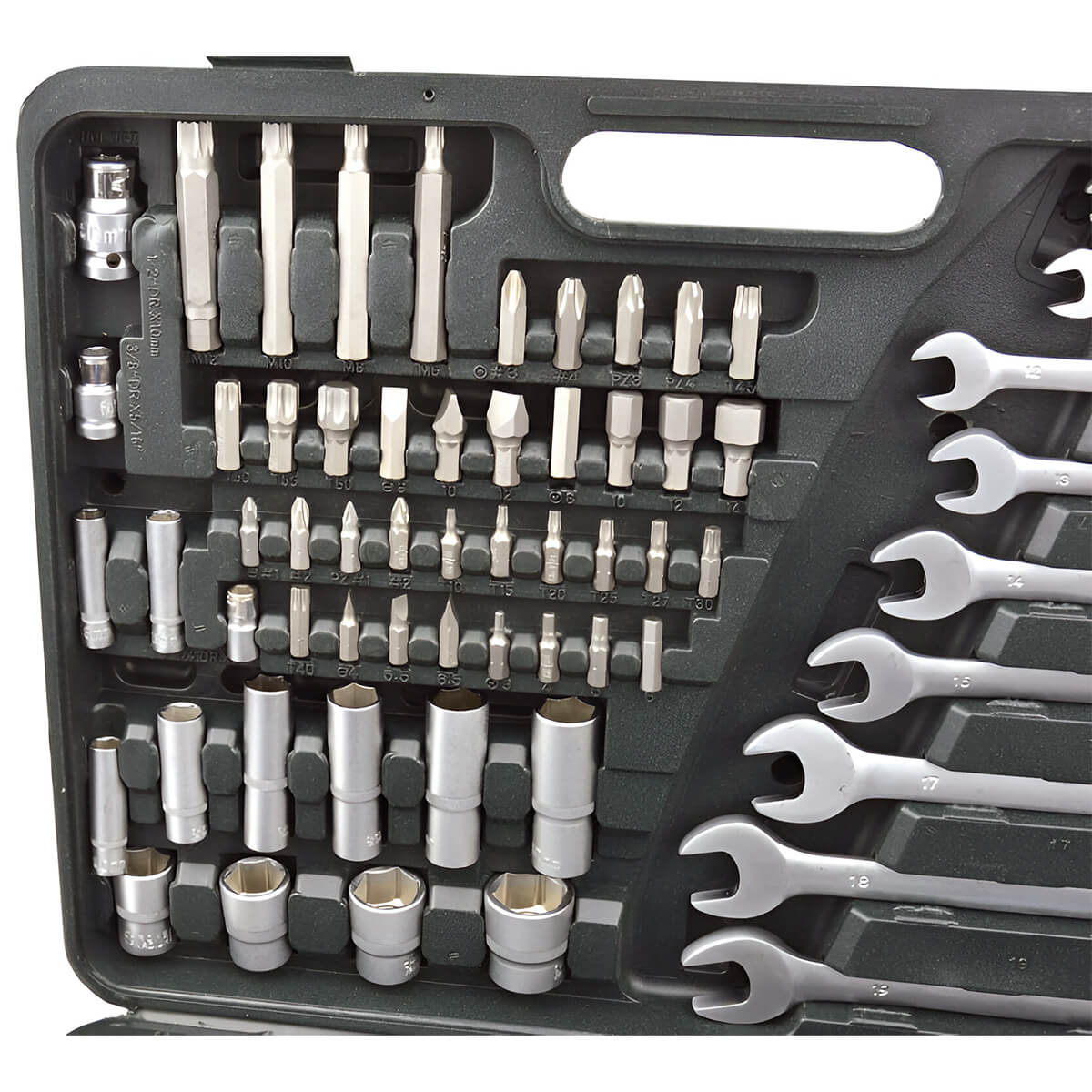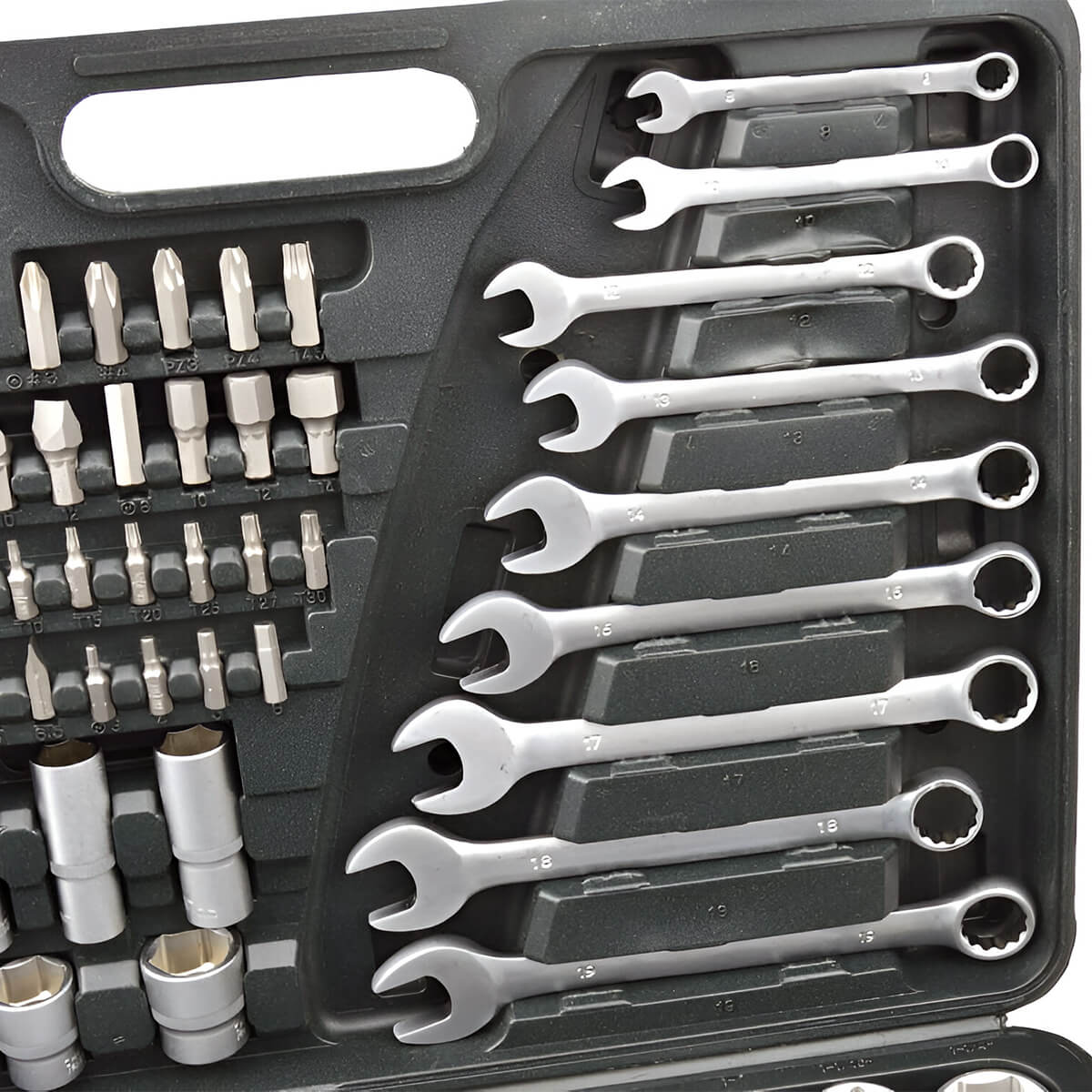 - Diversitate de instrumente: Setul include chei combinate, chei tubulare, biți pentru șurubelnițe și chei cu clichet 1/2", 3/8" și 1/4" cu 45 de dinți.