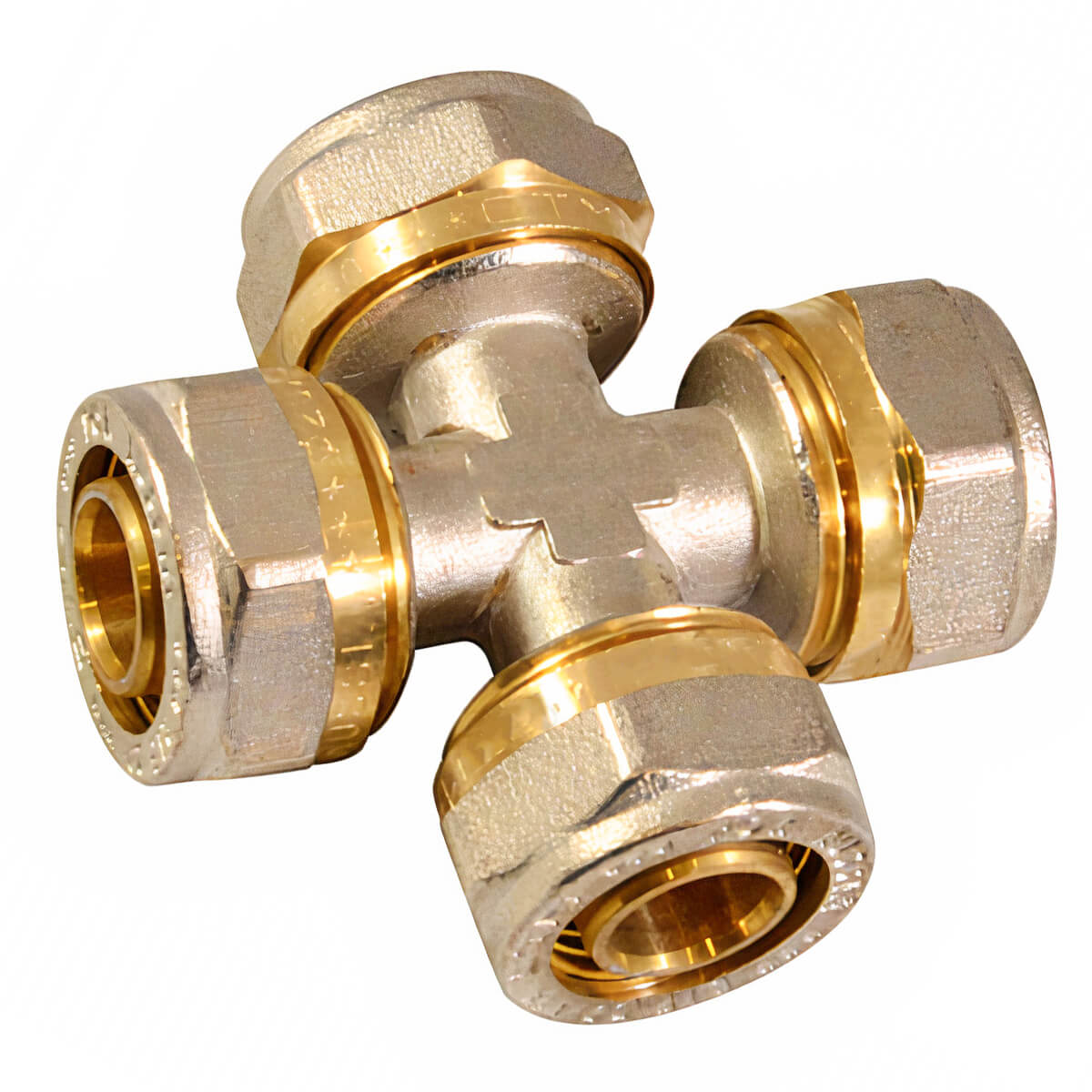 Cruce pentru țevi din metaloplast 20 x 20 x 20 x 20 mm - Folosit pentru a ramifica direcția de curgere a apei în trei direcții în alimentarea cu apă și încălzire. Se utilizează împreună cu țevile din metal-polimer cu diametrul de 20 mm prin metoda de strângere.