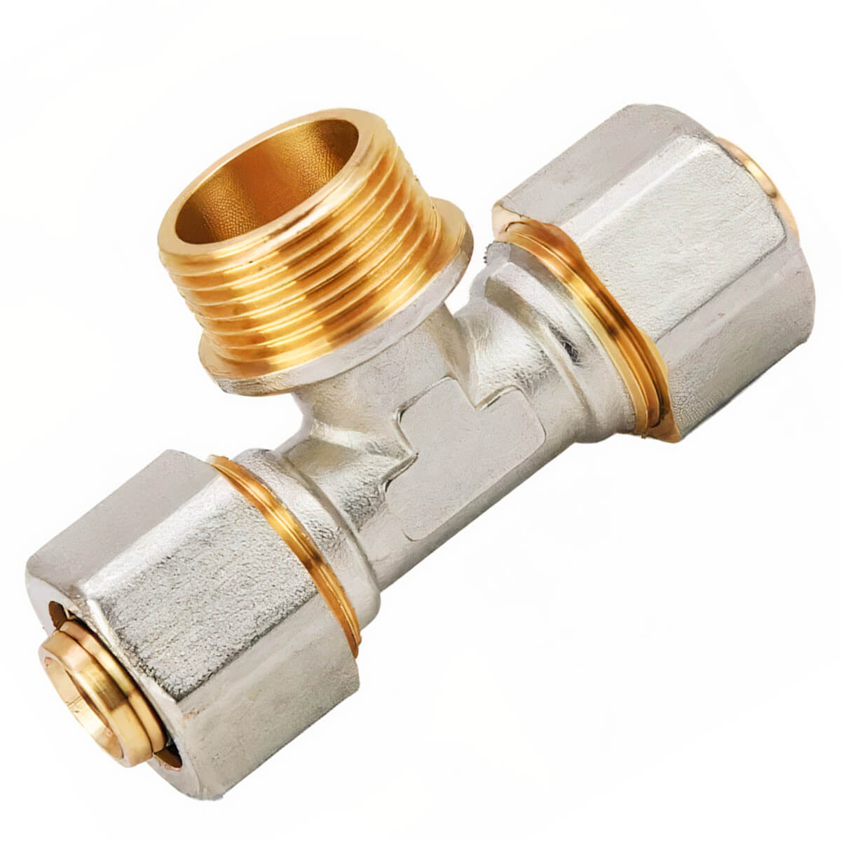 Teu HYDRO-S 16 mm x 1/2 filet exterior x 16 mm 0702235 - Folosit ca o ramificare a fluxului de apă în două direcții. Acest produs este format din două ieșiri pentru conectarea țevilor din metaloplast cu diametrul de 16 mm cu metoda de sertizare și o ieșire cu filet de 1/2".
