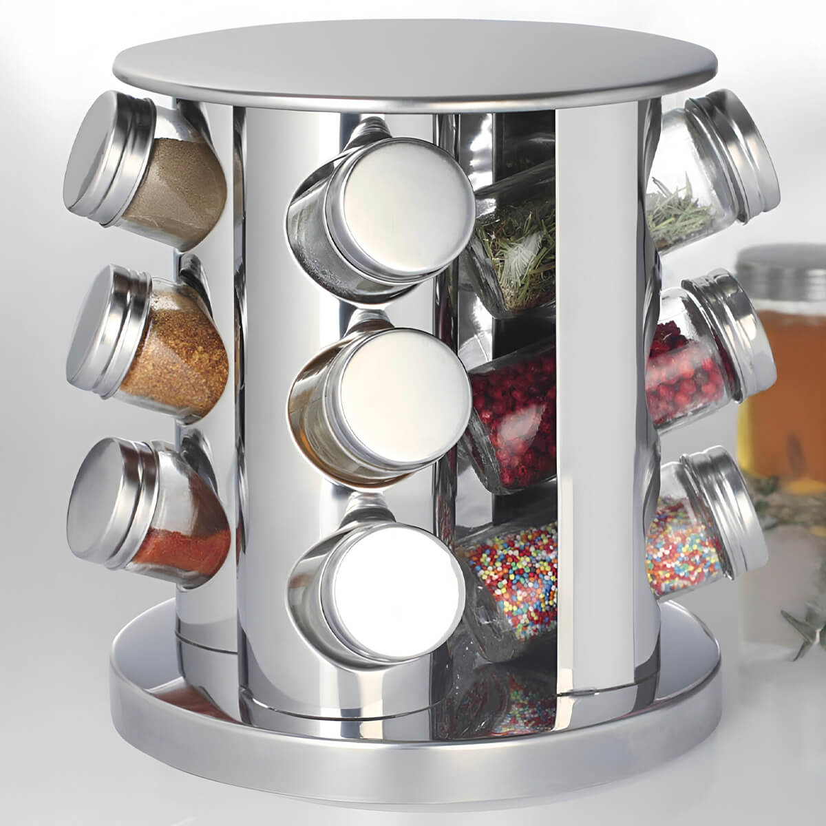 - Acces facil la 360°: suportul rotativ oferă acces rapid la fiecare borcan, fără a pierde timp căutând condimentele necesare.