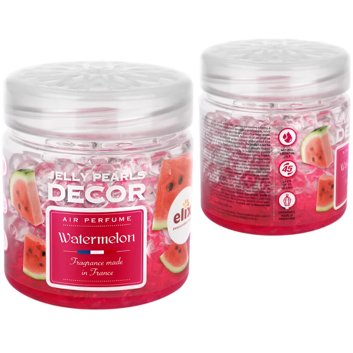Oferiți casei dumneavoastră un parfum dulce și suculent cu bilele de gel aromatizate ELIX Jelly Pearls Watermelon. Notele de vârf de pepene roșu, banană și iarbă proaspătă umplu spațiul cu prospețime, evoluând armonios spre un miez floral de trandafir, iasomie, violetă, lăcrămioare și liliac. Baza delicată de mosc adaugă un final elegant și rafinat.