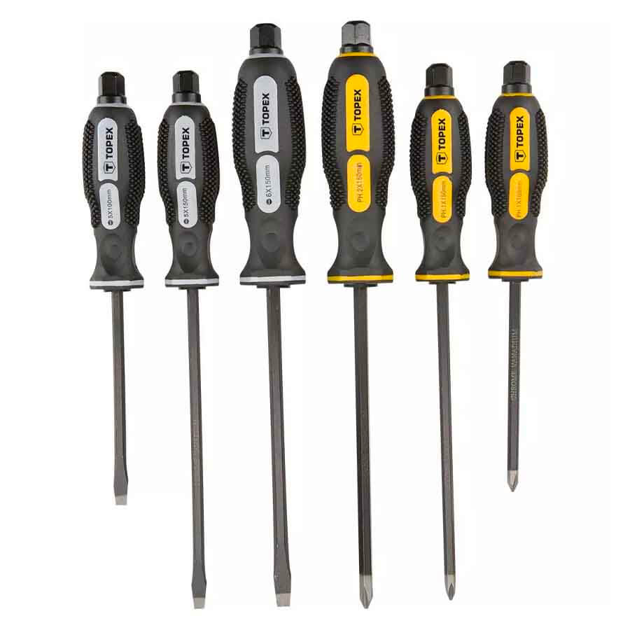 Setul de șurubelnițe cu impact TOPEX 6 buc. 39D506 este conceput pentru strângerea și desfacerea elementelor de fixare blocate și strânse cu o unealtă de impact. Oțelul crom-vanadiu durabil asigură o durată de exploatare îndelungată. Vârful magnetic din oțel călit facilitează munca, iar mânerul special din plastic bicomponent permite o prindere fermă. Setul vine cu un suport de depozitare din plastic.