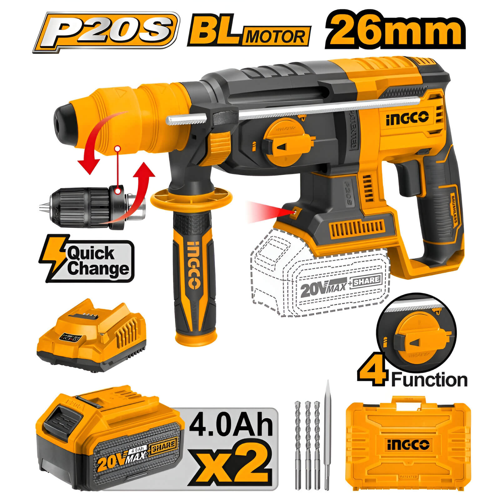 Ciocan rotopercutor cu acumulator INGCO, SDS+, Li-Ion, BL 20V, 2xAKB 4Ah CRHLI202289: Putere și Multifuncționalitate
