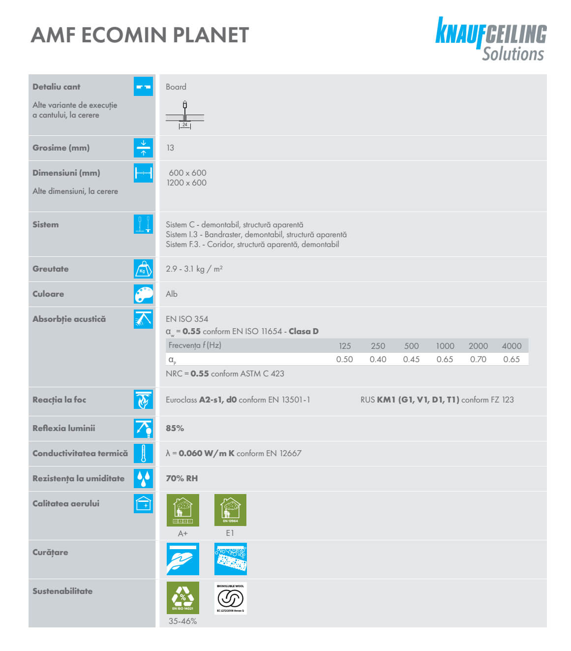 O soluție economă pentru a crea o acoperire ușoară și elegantă a tavanului. Calitatea germană și culoarea albă se potrivește cu o varietate de interioare. Placa are o textură intermediară, proprietăți bune de absorbție fonică și este potrivită pentru birouri, magazine și zone rezidențiale. Nu se recomandă utilizarea în încăperi umede.