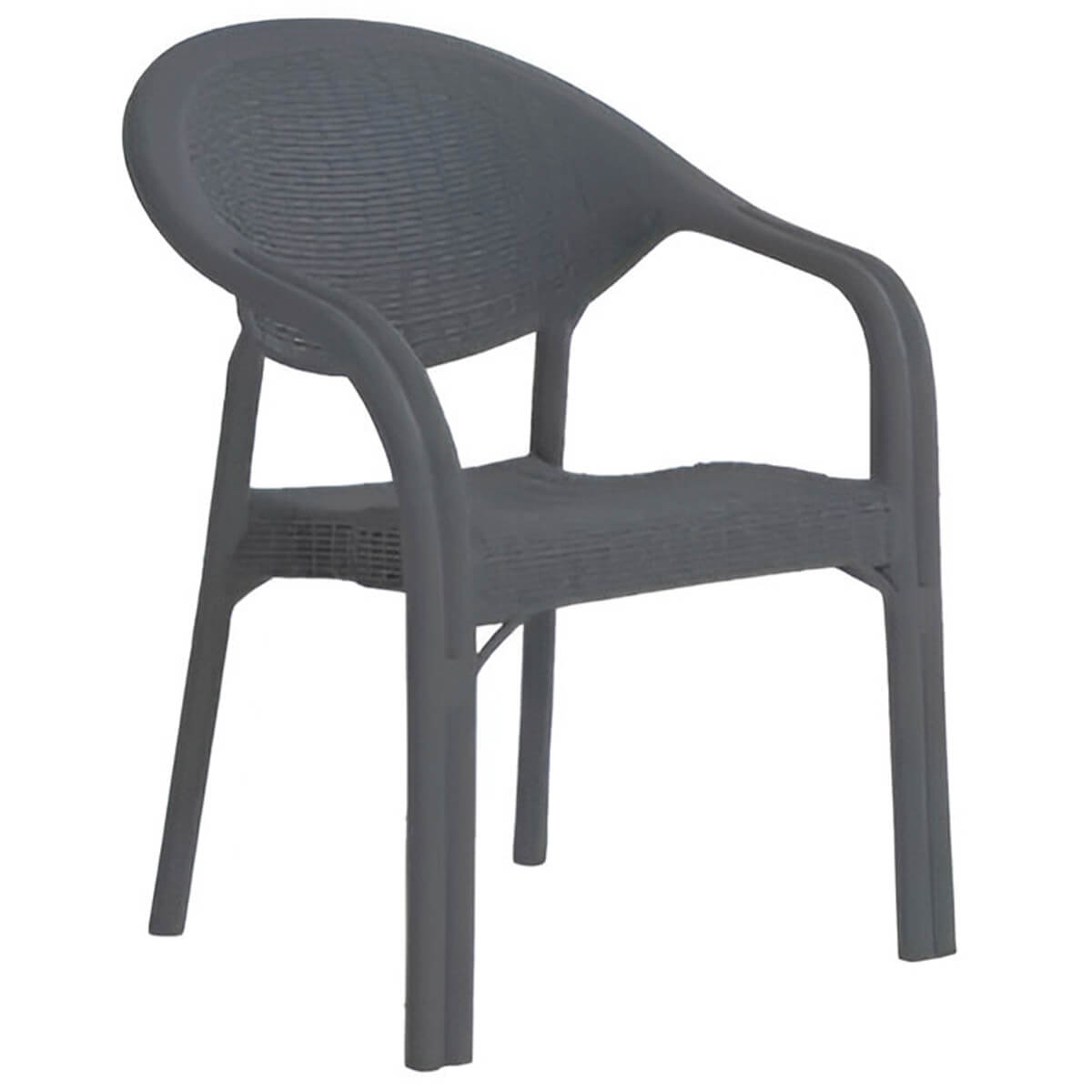 Estetica modelului este inspirată din textura ratanului artificial, însă scaunul este monobloc, fără elemente detașabile sau îmbinări inutile. Acest lucru elimină scârțâitul, instabilitatea și asigură o construcție solidă chiar și pe suprafețe denivelate. Nuanța antracit oferă un aspect elegant și versatil, ușor de asortat cu orice mobilier de grădină sau decor exterior.