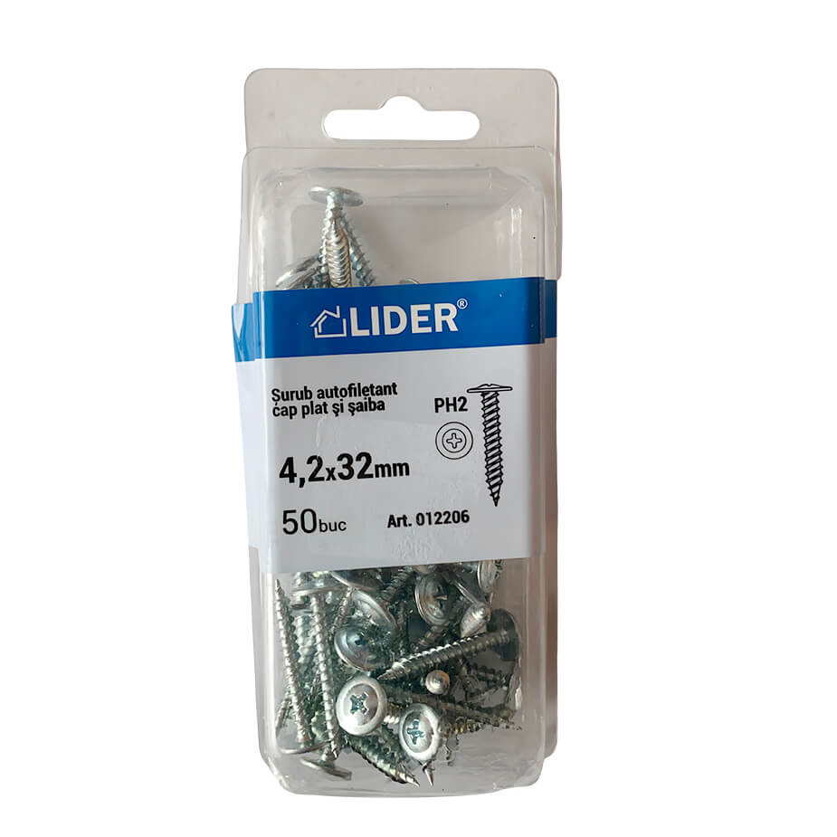 Șurub cu cap plat și șaibă Lider 4.2x32 mm zincat 50 bucăți (Art. 012206)