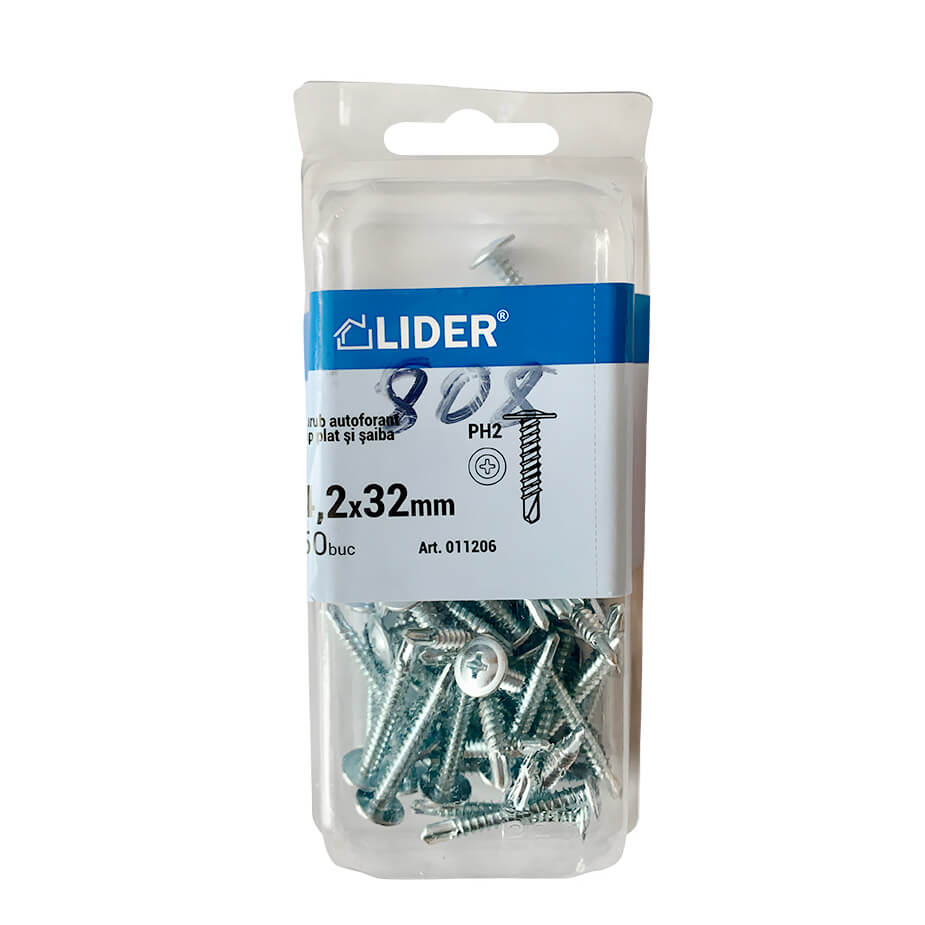 Șurub cu cap plat și șaibă Lider 4.2x32 mm cu burghiu zincat 50 bucăți (Art. 011206)