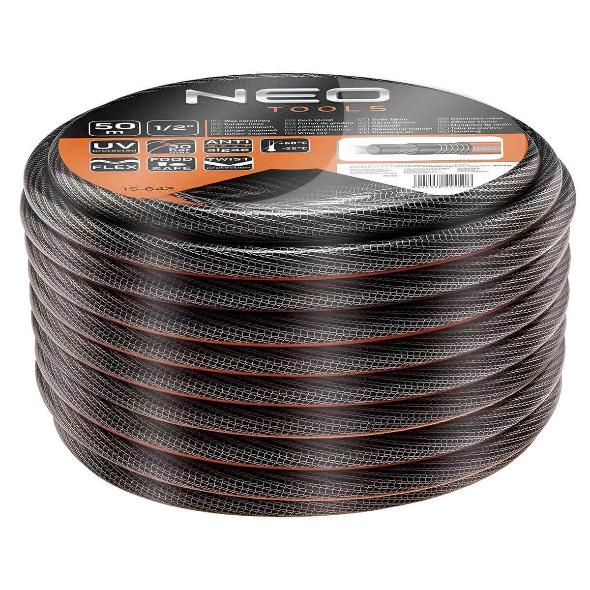 Furtun pentru grădină NEO Tools PROFESSIONAL 6-straturi 1/2" 15-840 - confecționat din PVC flexibil, întărit cu fir de poliester cu două împletituri. Ideal pentru întreținerea grădinii și curățarea mobilierului. Presiune de lucru: 10 bar, presiune de rupere: 30 bar. Sigur pentru alimente și echipat cu un sistem anti-tortură.