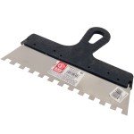 Șpaclu 250 mm 10x10 mm, din oțel inoxidabil, cu mâner din plastic, echipat cu un dinte mare pentru lucrul cu plăci mari.