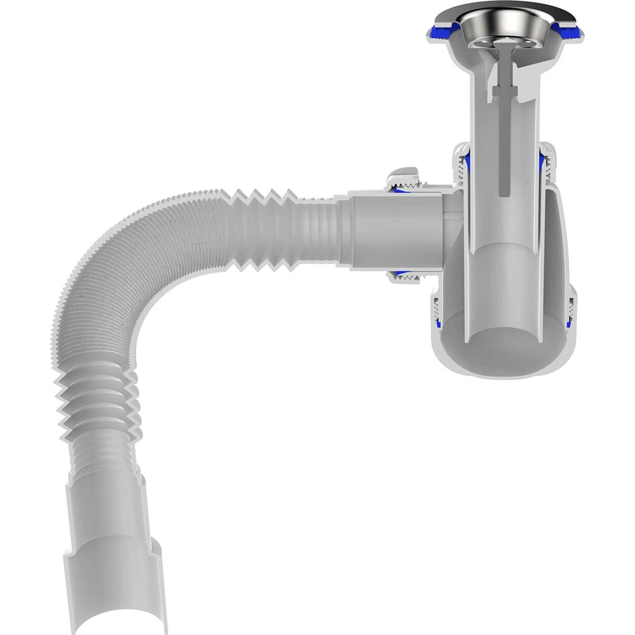Conexiune universală: Sifonul este prevăzut cu o țeavă flexibilă cu diametrul de 40 mm, care se poate conecta ușor la canalizarea cu două diametre standard - 40 și 50 mm. Acest lucru asigură o montare ușoară și compatibilitate cu diferite sisteme de canalizare.