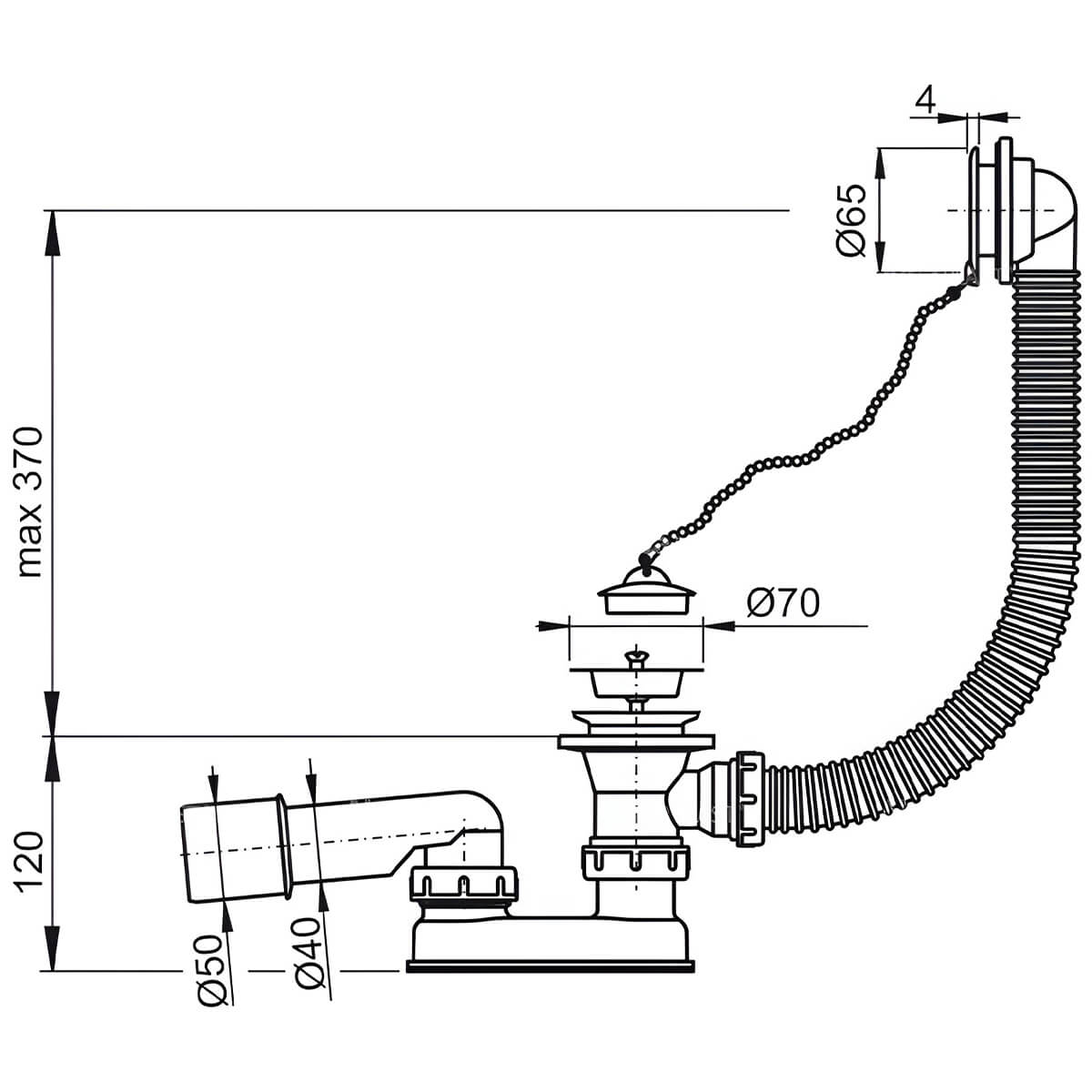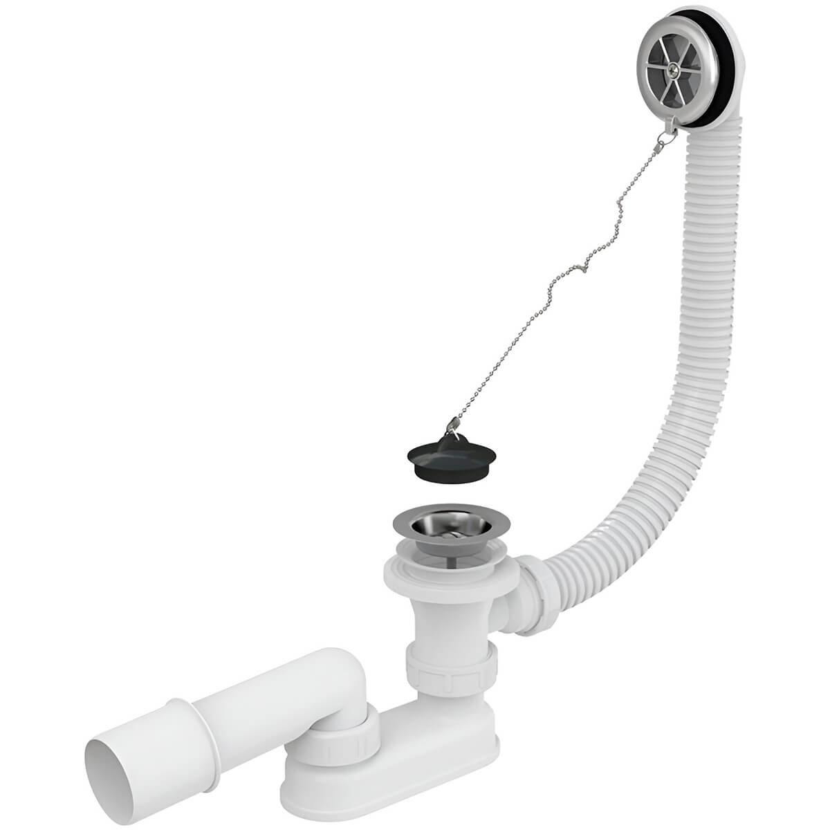 Sifon pentru cadă Alca Plast crom, lungime 570 mm, cu dop cu lanț A501 - O soluție fiabilă pentru scurgerea căzii de baie în canalizare și prevenirea revărsărilor. Compatibilă cu căzi de dimensiuni standard. Rezistență termică de până la 95°C și rezistență la captarea mirosurilor de până la 588 Pa. Se completează cu un dop cu lanț și un furtun flexibil de revărsare. Capcana pentru mirosuri din polipropilenă este rezistentă termic și chimic.