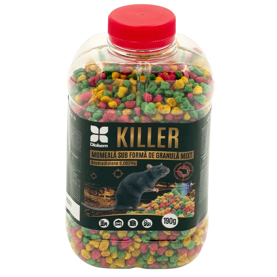 Produs pentru combaterea rozătoarelor Diolsem KILLER 190 g - O nouă generație de momeală granulară pentru controlul rozătoarelor. Gata de utilizare, ambalată într-un tub de plastic cu capac. Sigur pentru animalele de companie și asigură o protecție eficientă împotriva șobolanilor, șoarecilor și a altor rozătoare.