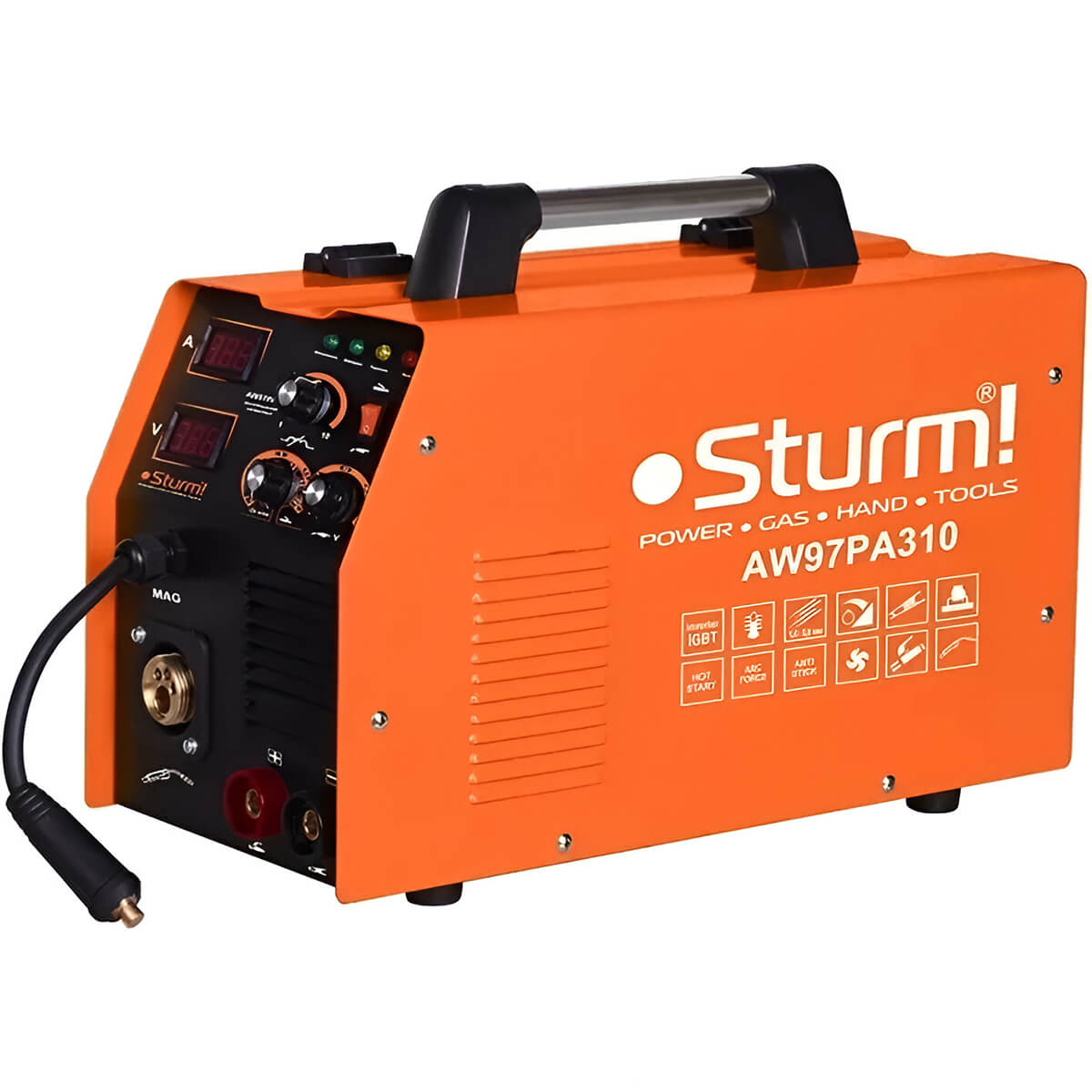 Aparat de sudat semiautomat invertor Sturm MIG/MAG/MMA 310 A AW97PA310 — un dispozitiv puternic și universal, creat pentru sudarea, tăierea și depunerea aliajelor de oțel (inclusiv oțel inoxidabil) și aluminiu. Curentul de sudare este reglabil în intervalul de la 20 la 310 A, iar puterea aparatului este de 8 kW, ceea ce permite utilizarea sa atât în producție și service-uri auto, cât și în gospodării comunale. Datorită controlului simplu, acest aparat este potrivit atât pentru profesioniști, cât și pentru începători în sudură.