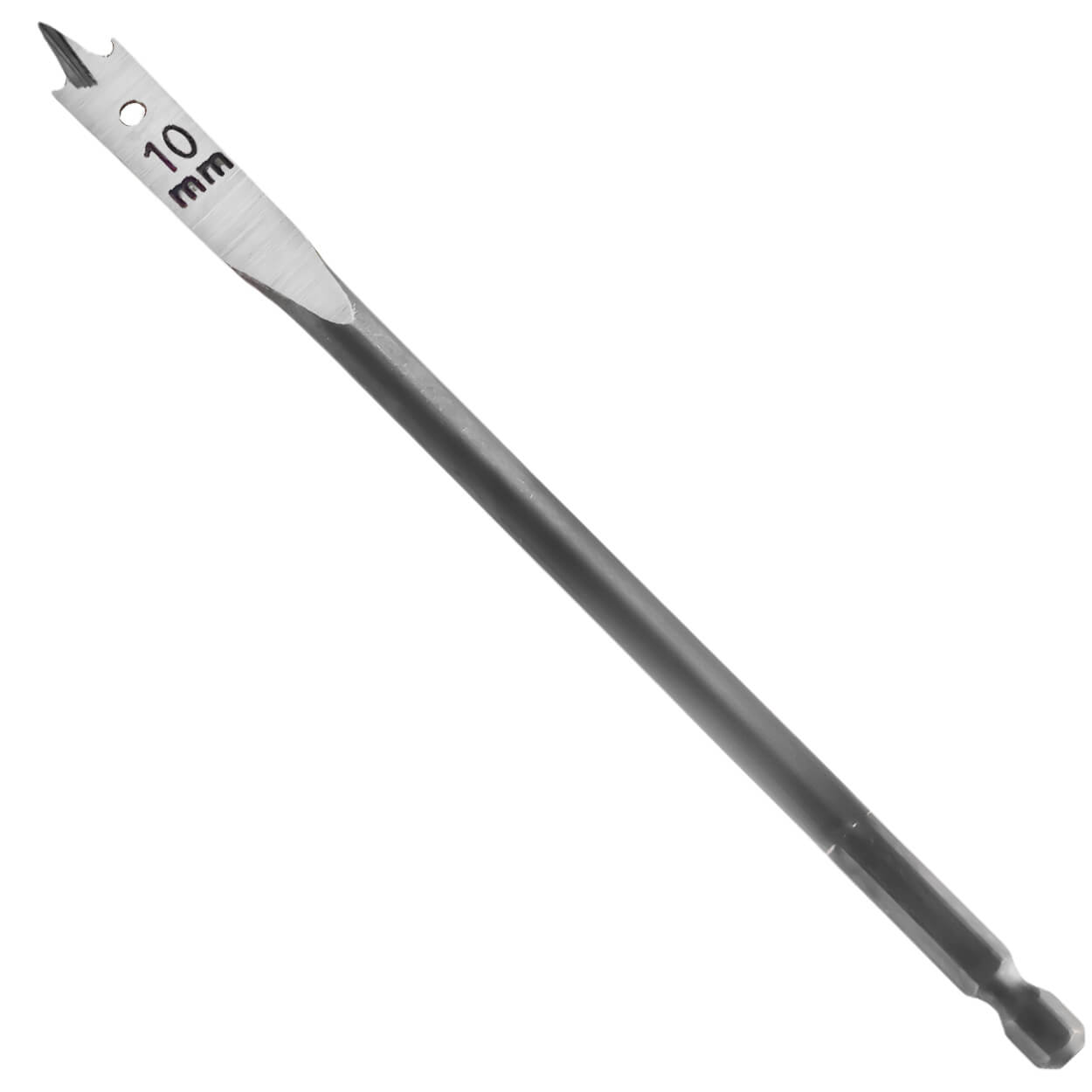 Burghiu plat pentru lemn PROJAHN 10 mm, 155 mm (Art. 19610) - un instrument fabricat din oțel rapid temperat (WS). Este echipat cu o coadă hexagonală de 1/4 inch, vârf centralizator ascuțit și muchii de tăiere. Se utilizează pentru lucrul atât cu lemn moale, cât și cu lemn tare, precum și cu gips-carton.