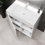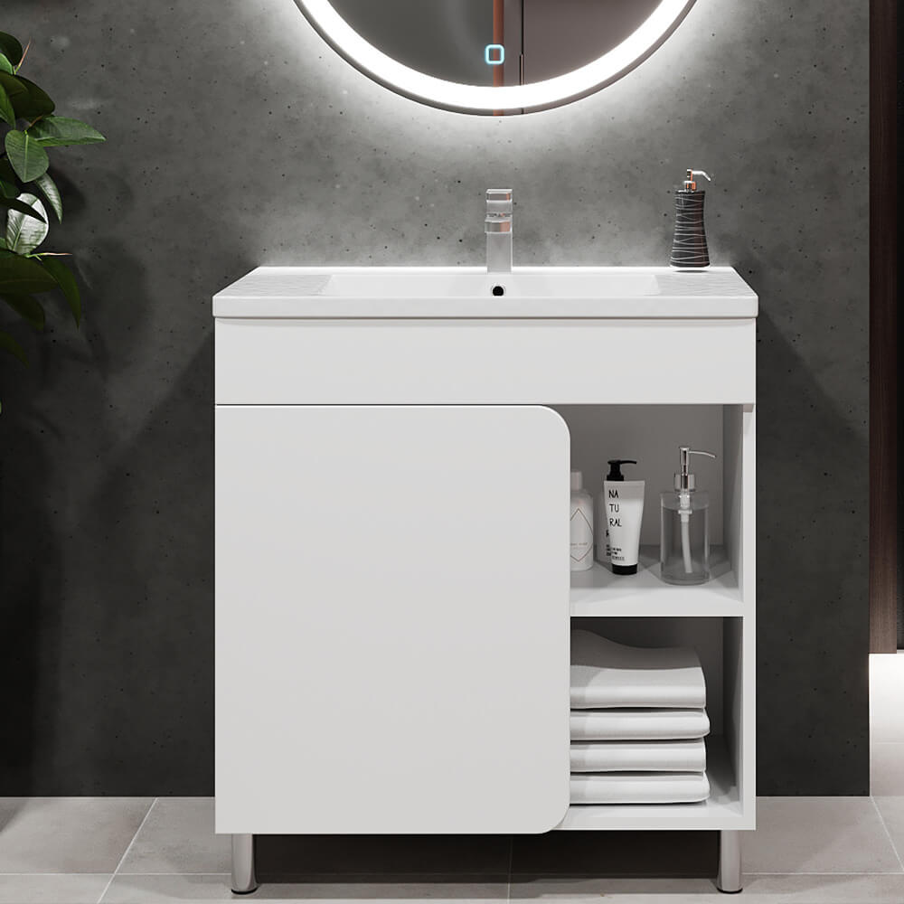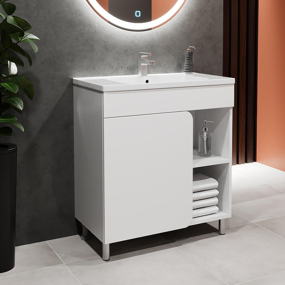 Corpul este realizat din PAL melaminat, iar frontul din MDF vopsit. Ușa batantă ascunde compartimentul principal, iar rafturile deschise sunt potrivite pentru prosoape și obiecte de uz zilnic. Mecanismul de închidere lentă asigură o utilizare silențioasă și confortabilă.