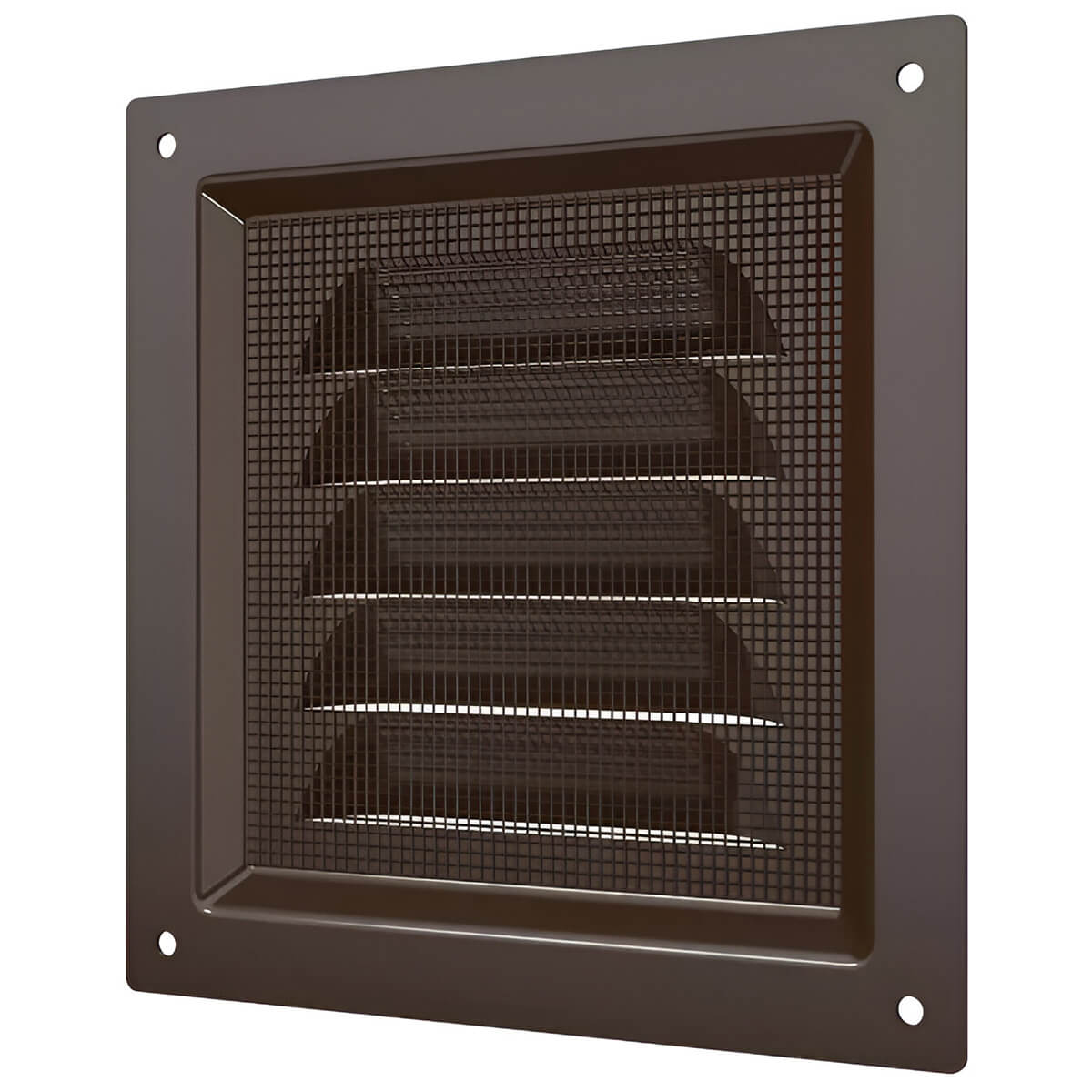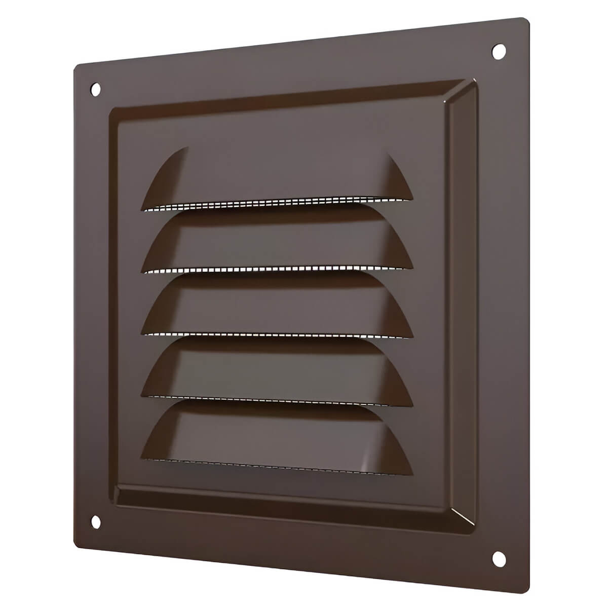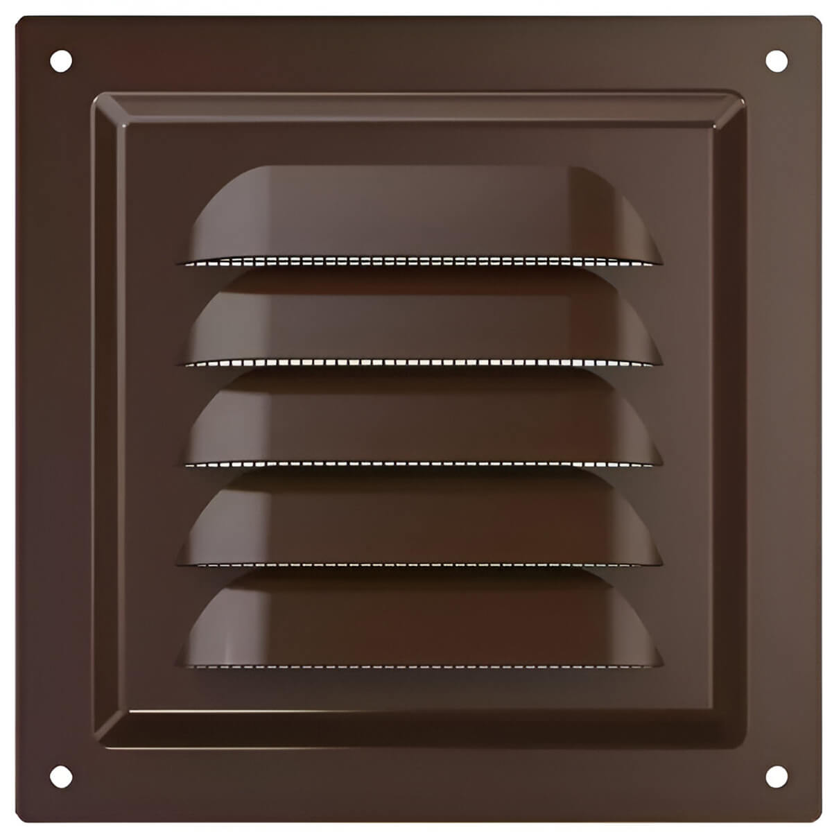 Grilă de ventilație din metal Mistral cu plasă 125x125 mm maro 1212ME - soluție ideală pentru ventilația băilor, toaletelor, bucătăriilor și a altor încăperi. Echipat cu lamele înclinate și plasă de țânțari. Ușor de instalat cu ajutorul șuruburilor autofiletante.