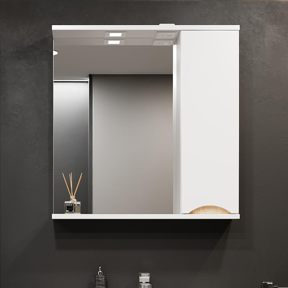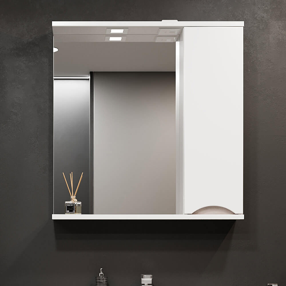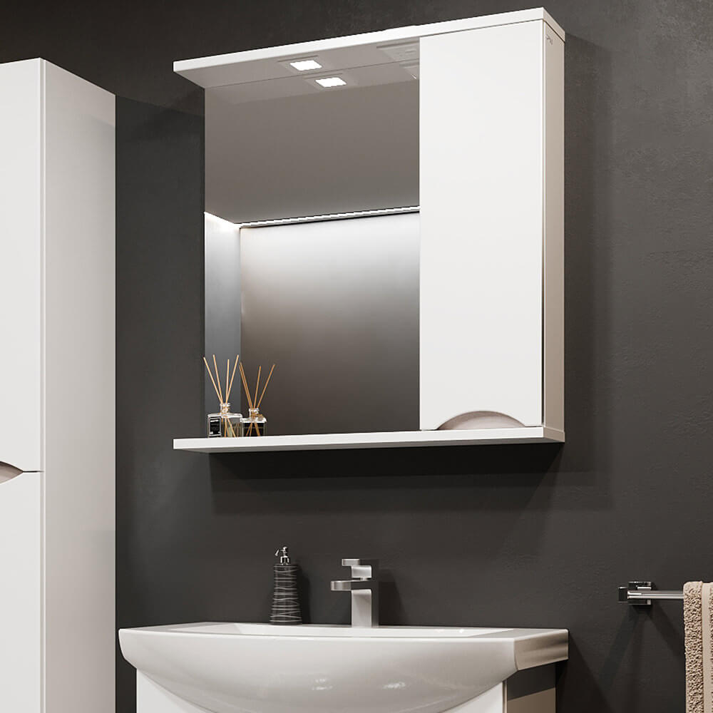 Dulapul cu oglindă pentru baie Bayro Elara 750×750 mm, dreapta, alb mat este o soluție compactă „2 în 1”: oglindă pentru îngrijirea zilnică și spațiu de depozitare închis pentru cosmetice și obiecte de uz casnic. Modulul din partea dreaptă ajută la menținerea ordinii în zona lavoarului, iar culoarea alb mat se potrivește ușor cu orice obiect sanitar.