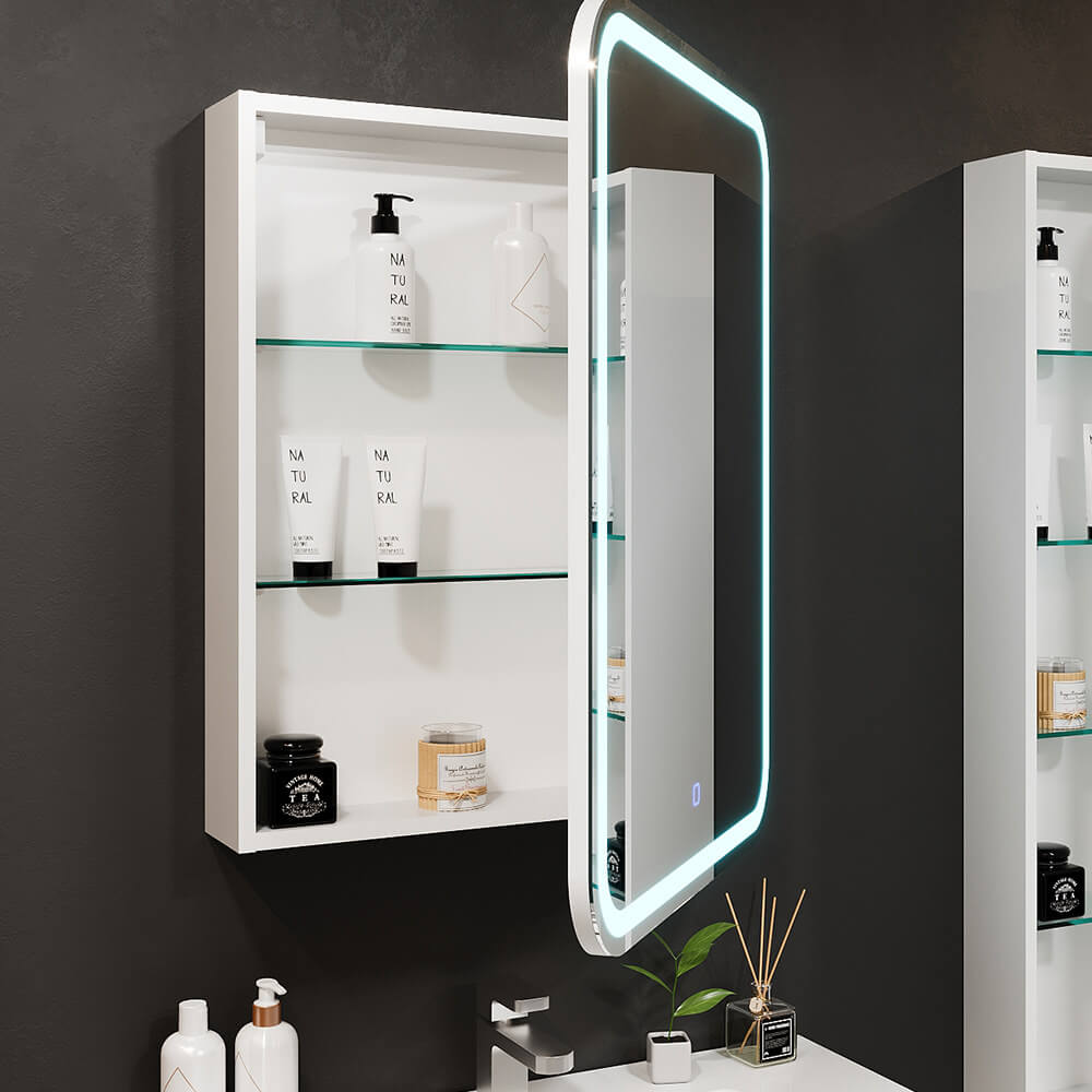 Fațada este realizată din oglindă, astfel dulapul funcționează ca o oglindă murală completă, iar interiorul ajută la menținerea ordinii fără obiecte la vedere. Iluminarea integrată simplifică rutina de dimineață și de seară, iar butonul tactil permite aprinderea luminii dintr-o singură atingere.