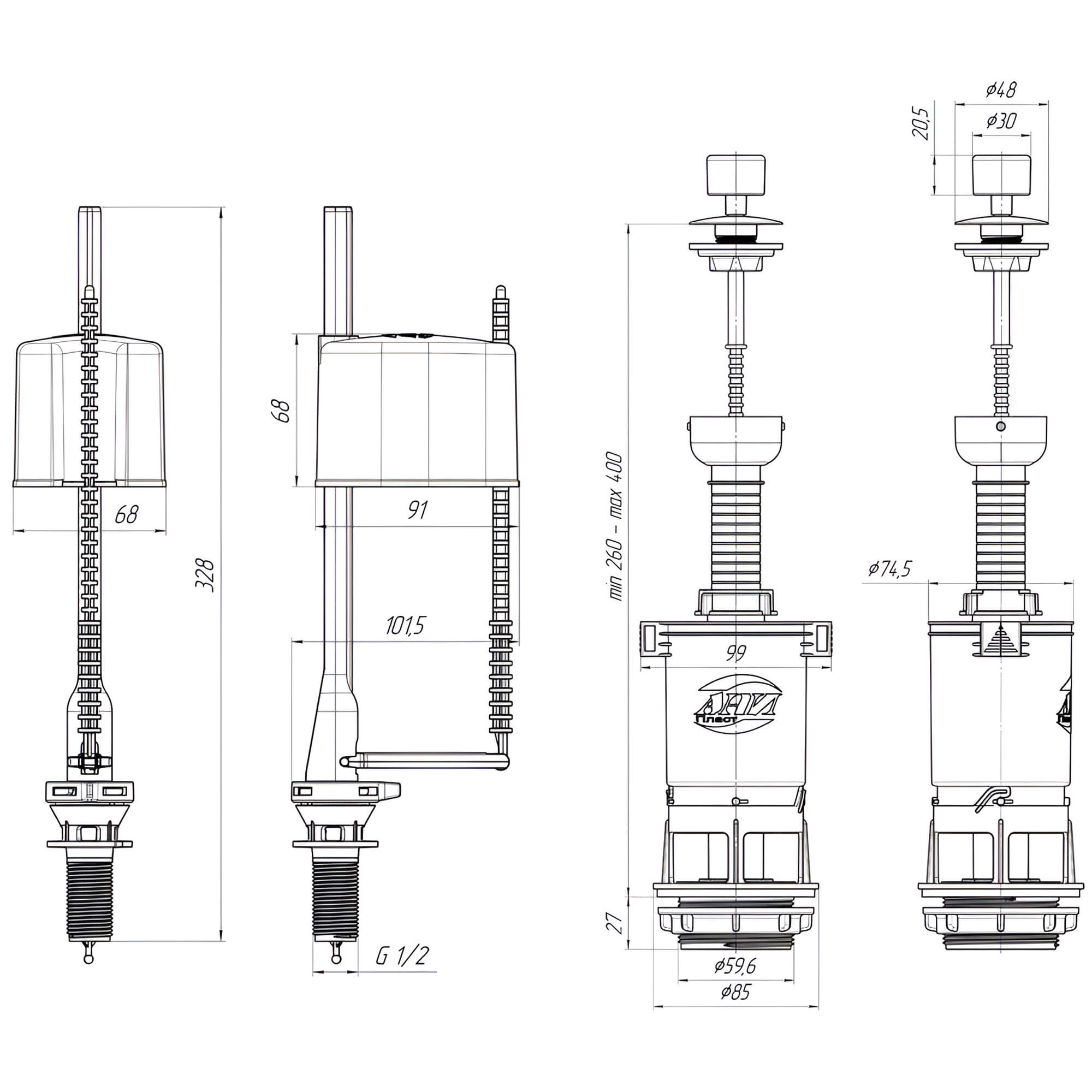 - Регулируемая высота сливной арматуры от 260 до 400 мм — универсальное применение для разных моделей бачков.
