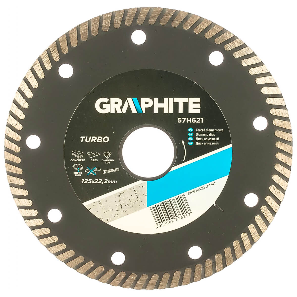 Диск алмазный ультра тонкий turbo GRAPHITE 57H621 выполнен из высококачественного сплава марганцевой стали, предназначен для использования на ручных углошлифовальных машинах при резке бетона, гранита, мрамора, кирпича, керамической плитки и прочих твердых строительных материалов. Благодаря уменьшенной толщине диска скорость резки увеличивается в два раза. Алмазные сегменты высокой прочности обеспечивают эффективную резку. Диск алмазный ультра тонкий turbo GRAPHITE подходит для тяжелых строительных работ.