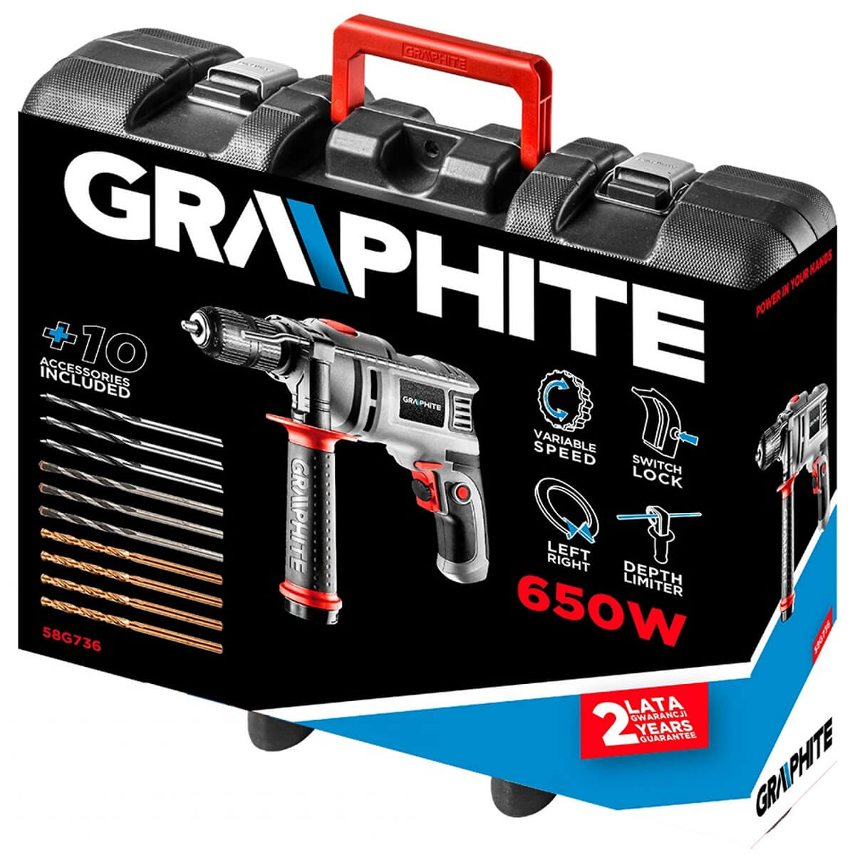 Ударная дрель GRAPHITE 58G736 применяется для сверления отверстий в различных видов материала. Использование данной модели можно обозначить на строительных, столярных, отделочных и других работах. Модель оснащена функцией реверса, для изменения направления вращения шпинделя. Смена оснастки занимает крайне мало времени за счет быстрозажимного патрона, что обеспечит быстрое манипулирование инструментом.