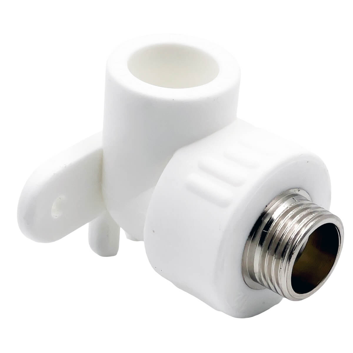 Угол полипропиленовый с настенным креплением Sereneplast d.20 мм х 1/2" НР - предназначен для надежного соединения труб под углом. Изготовлен из прочного полипропилена, идеально подходит для различных водопроводных систем и установок.