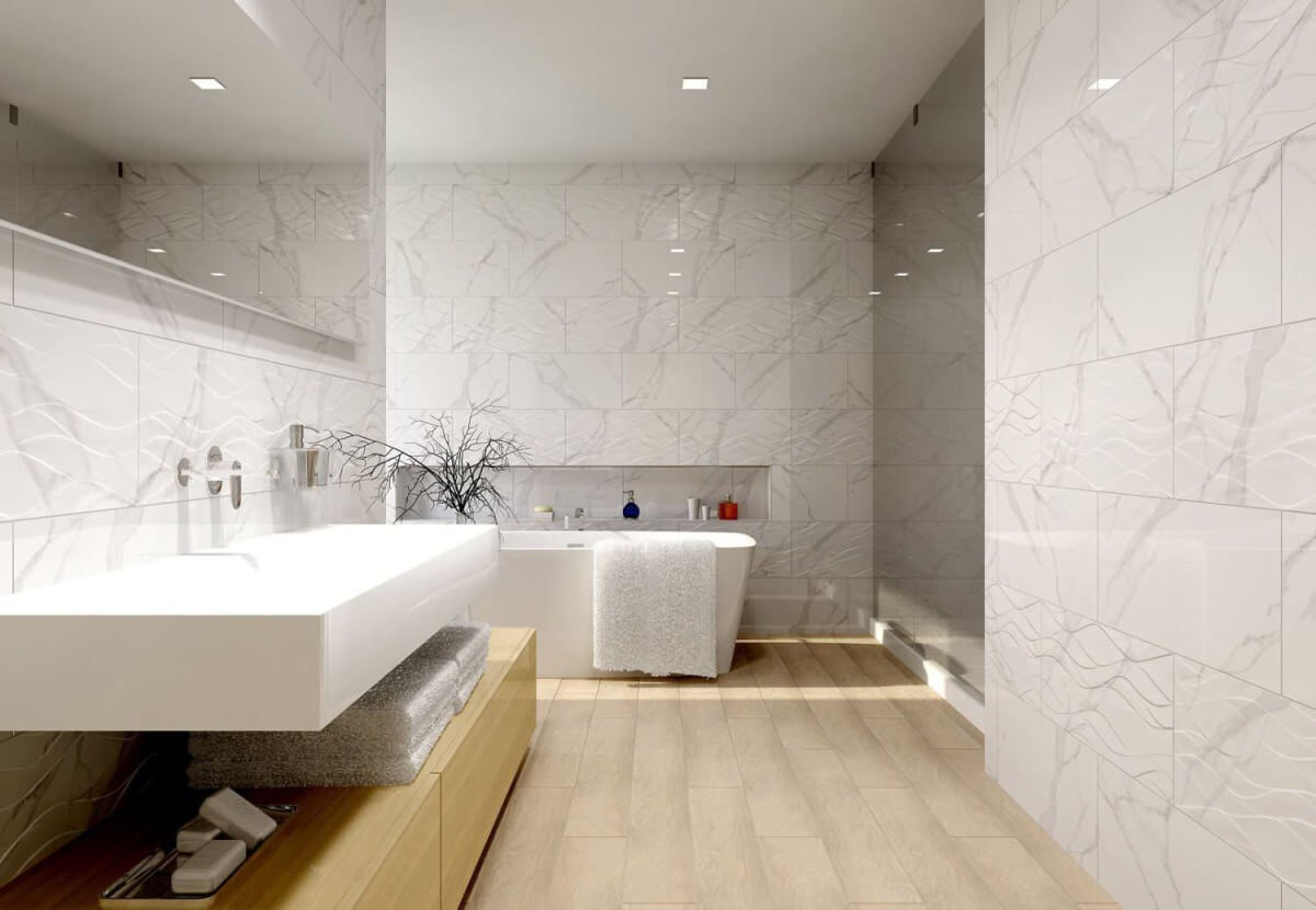 Благодаря универсальному формату 300х600 мм плитка легко комбинируется с другими элементами отделки и позволяет создавать как классические, так и современные композиции. Серый оттенок с мягкими прожилками добавляет интерьеру спокойствия и утончённости, а глянцевая поверхность визуально расширяет пространство и делает его более светлым.